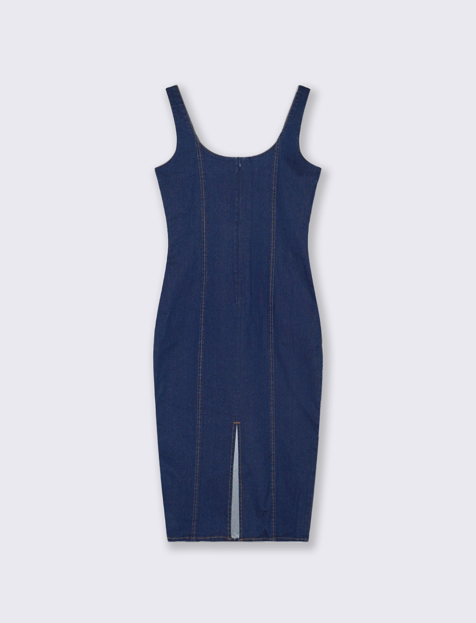 Vestito longuette in denim smanicato stretch con chiusura zip sul retro. Il prodotto è di colore Denim