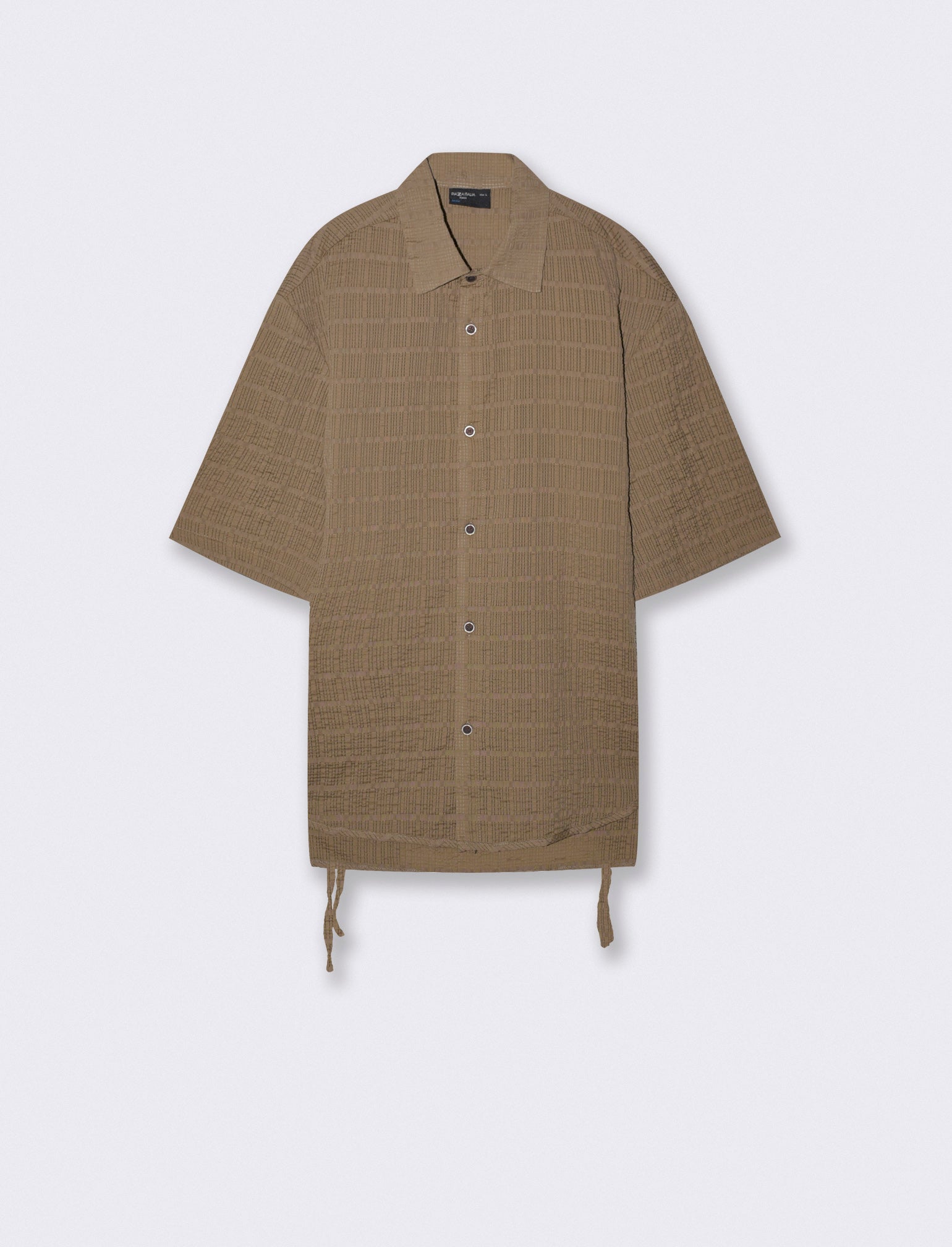 Camicia boxy fit realizzata in tessuto seer sucker. Collo francese e maniche corte. Chiusura frontale con abbottonatura a vista. Lacci al fondo. Il prodotto è di colore Verde kaki
