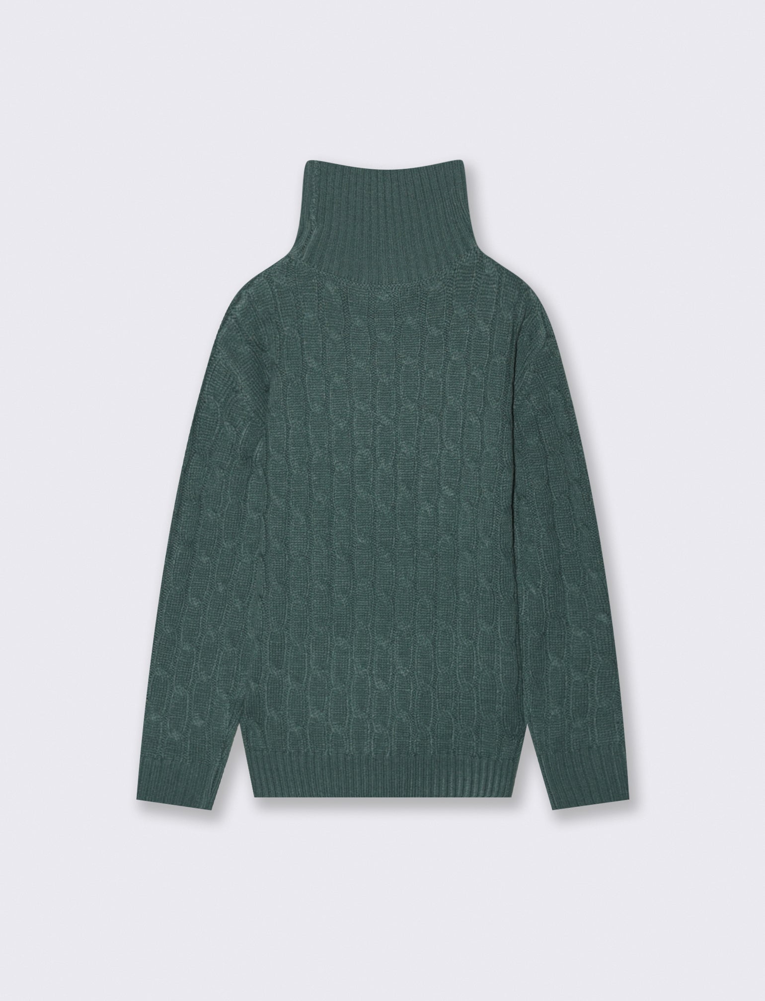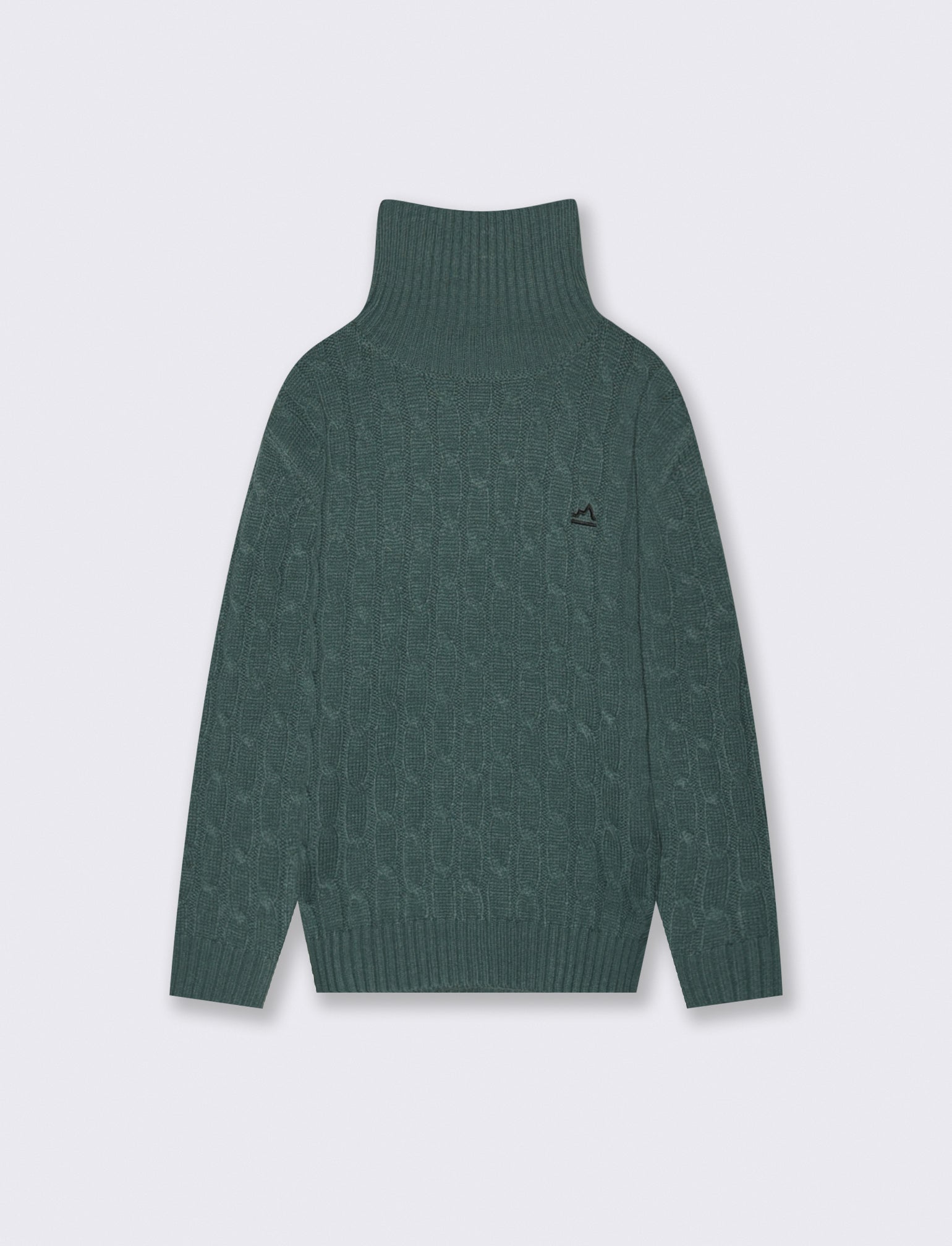 Maglia lavorazione a treccia,modello collo alto , manica lunga. Fondo maglia e polsi in costina. Ricamo frontale. Articolo casual ideale per divere occasioni invernali. Il prodotto è di colore Verde