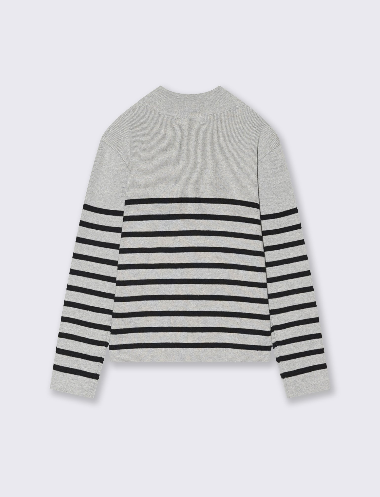 Maglioncino mezzo collo con zip, manica lunga fantasia rigato. Placchetta frontale. Ideale per il tempo libero. Il prodotto è di colore Grigio mel.