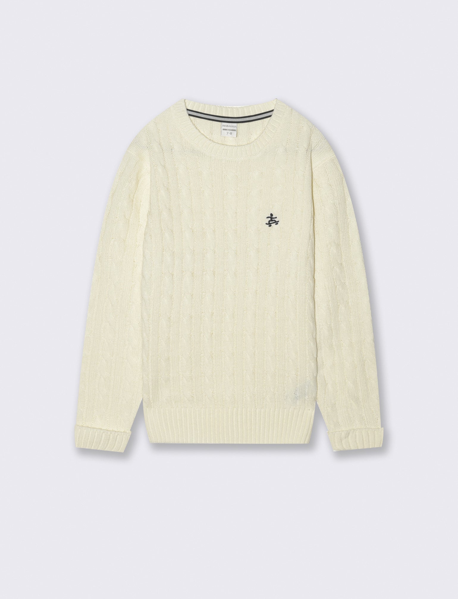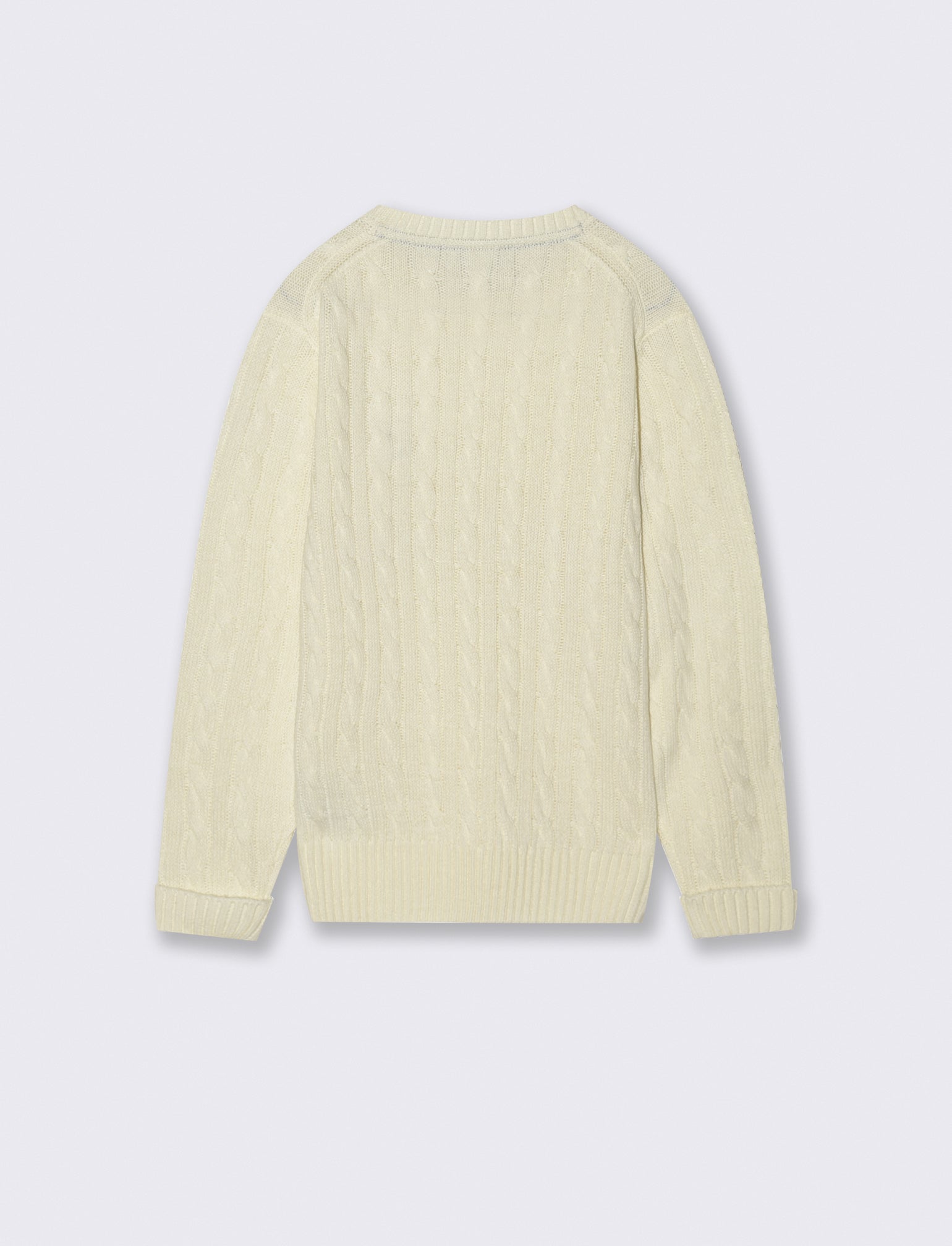 Maglia lavorazione a treccia,modello girocollo , manica lunga. Fondo maglia e polsi in costina. Ricamo frontale. Articolo casual ideale per divere occasioni invernali. Il prodotto è di colore Bianco latte