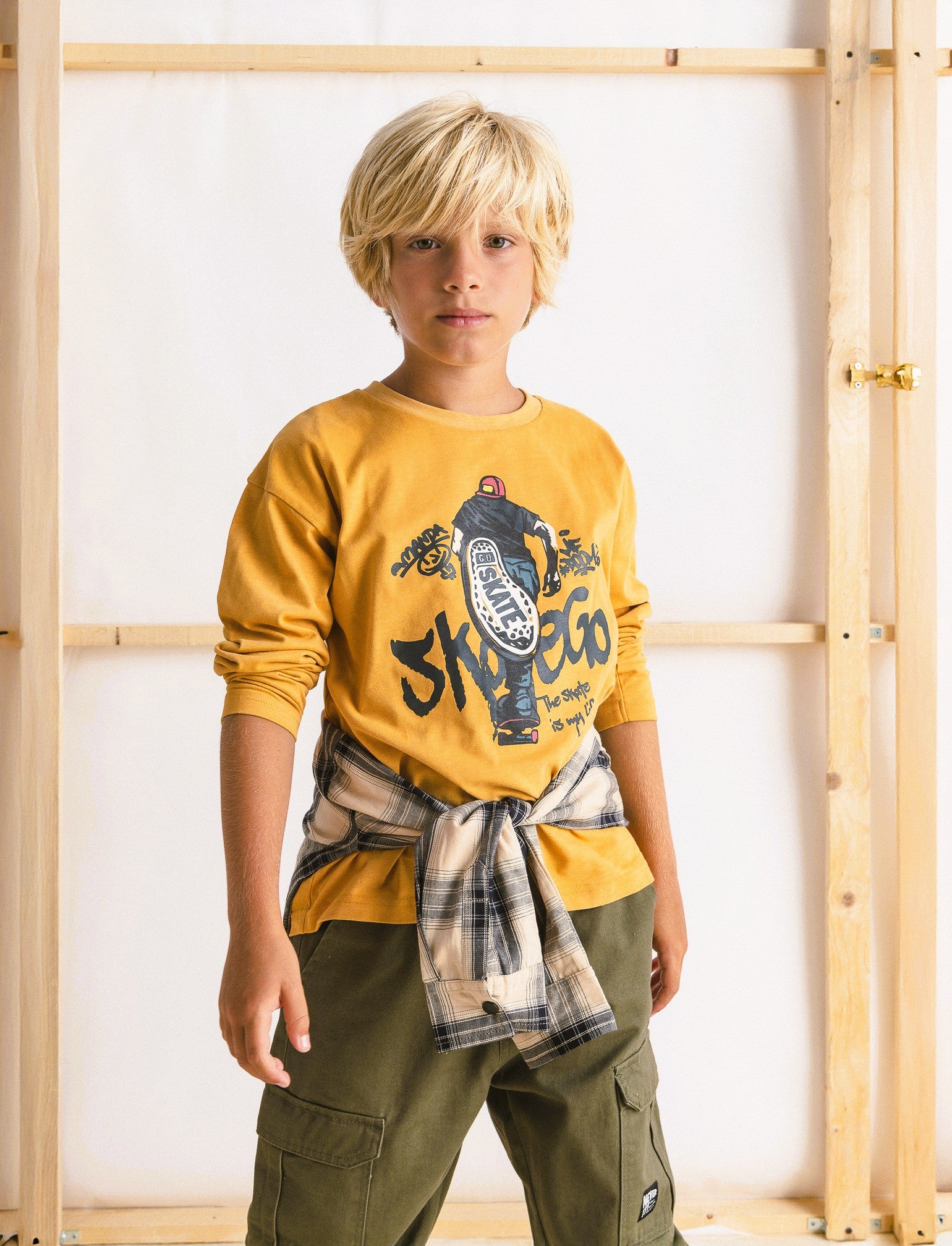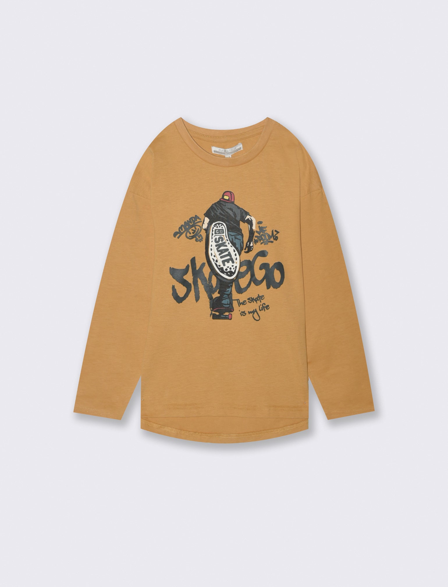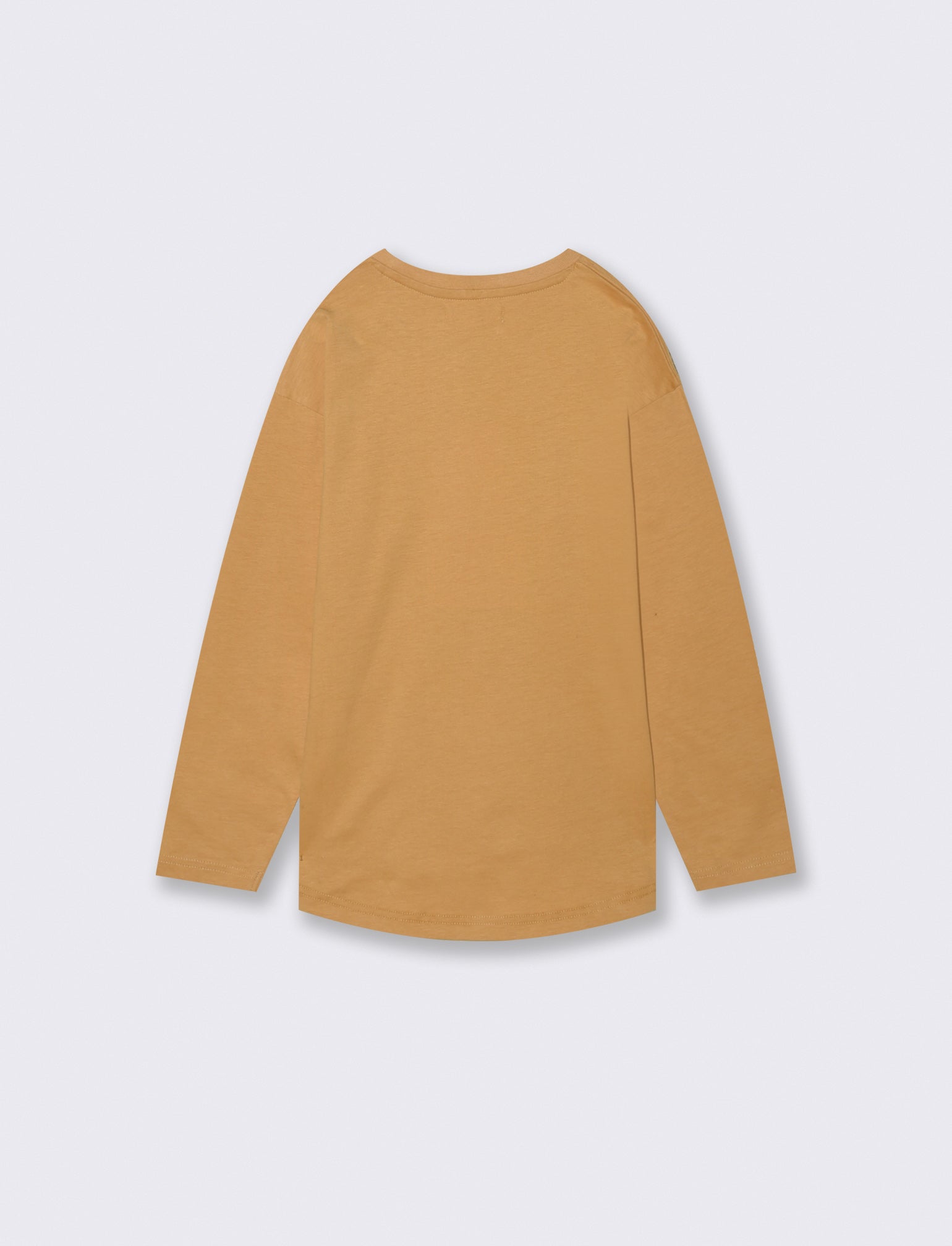 Maglia a maniche lunghe in morbido jersey di cotone. Bordo a costine sullo scollo. Il capo presenta una stampa frontale in stile street. Disponibile in diversi colori. Vestibilità loose, utilizzabile in qualsiasi occasione. Il prodotto è di colore Senape