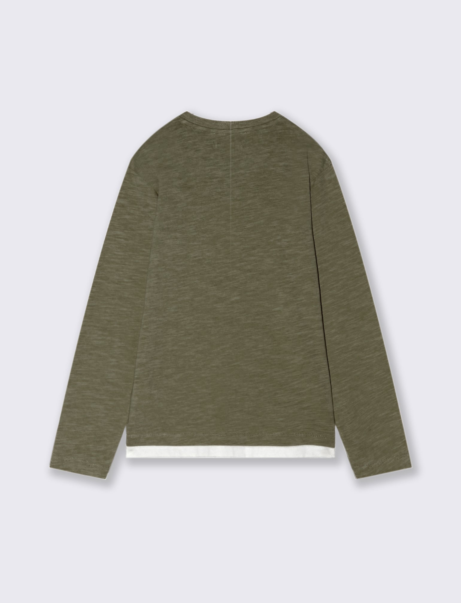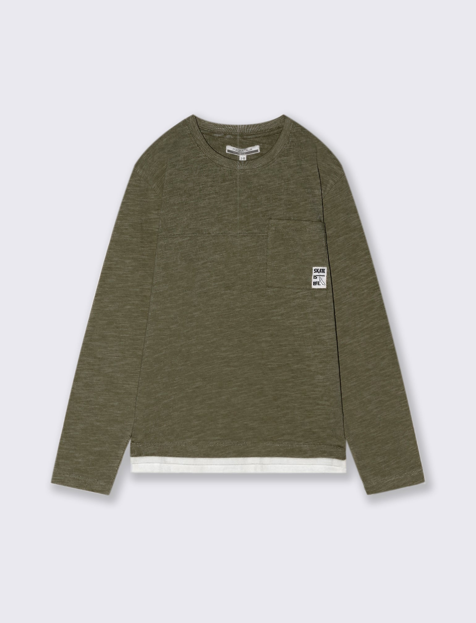 Maglia girocollo e maniche lunghe in cotone. Il capo presenta un taglio sul davanti e un taschino applicato arricchito da un patch. Disponibile in due colori. Vestibilità regular, ideale per un occasione casual. Il prodotto è di colore Verde militare