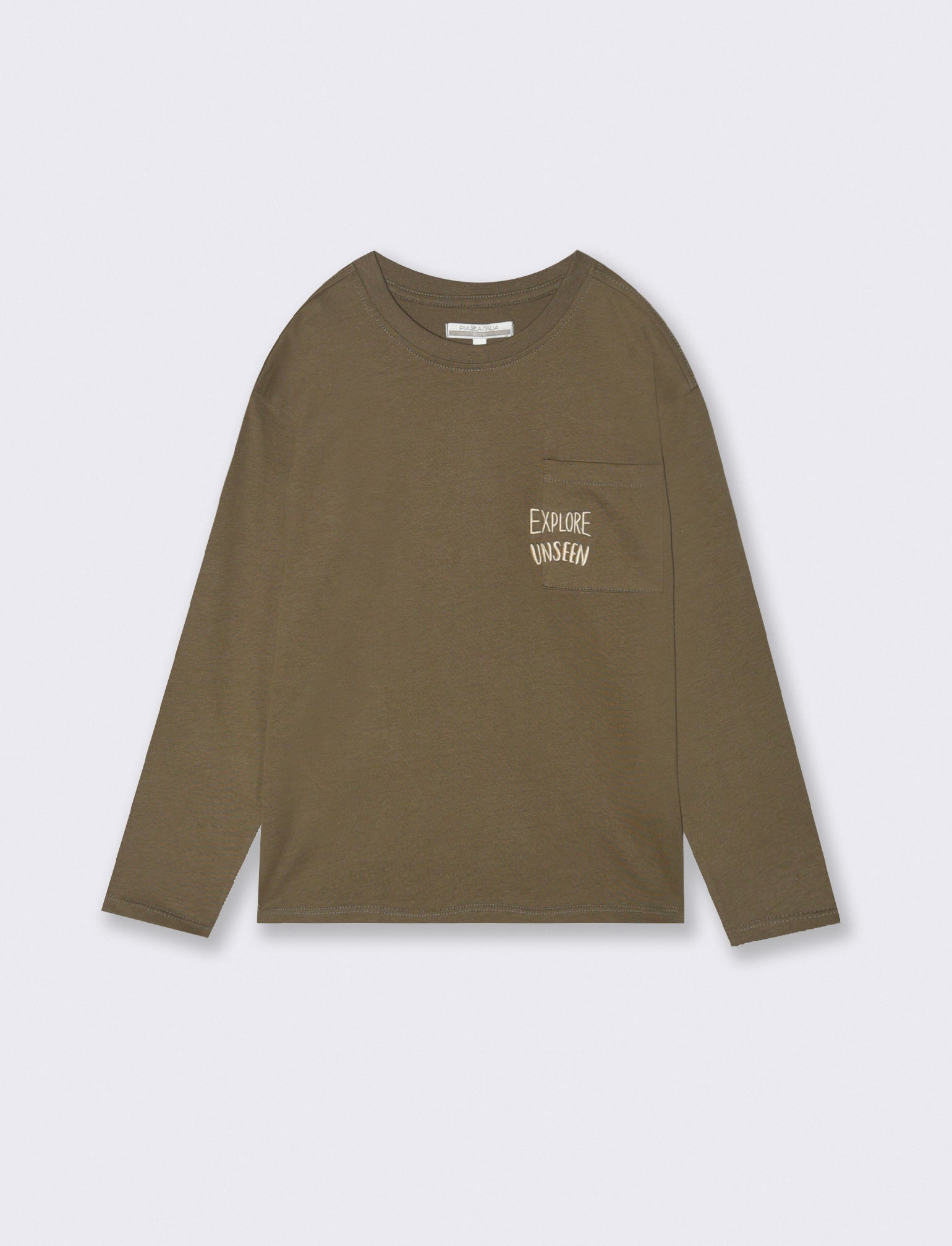 T-shirt in cotone mano calda con taschino e ricamo sul davanti e stampa sul retro, modello girocollo adatto al tempo libero. Il prodotto è di colore Verde militare