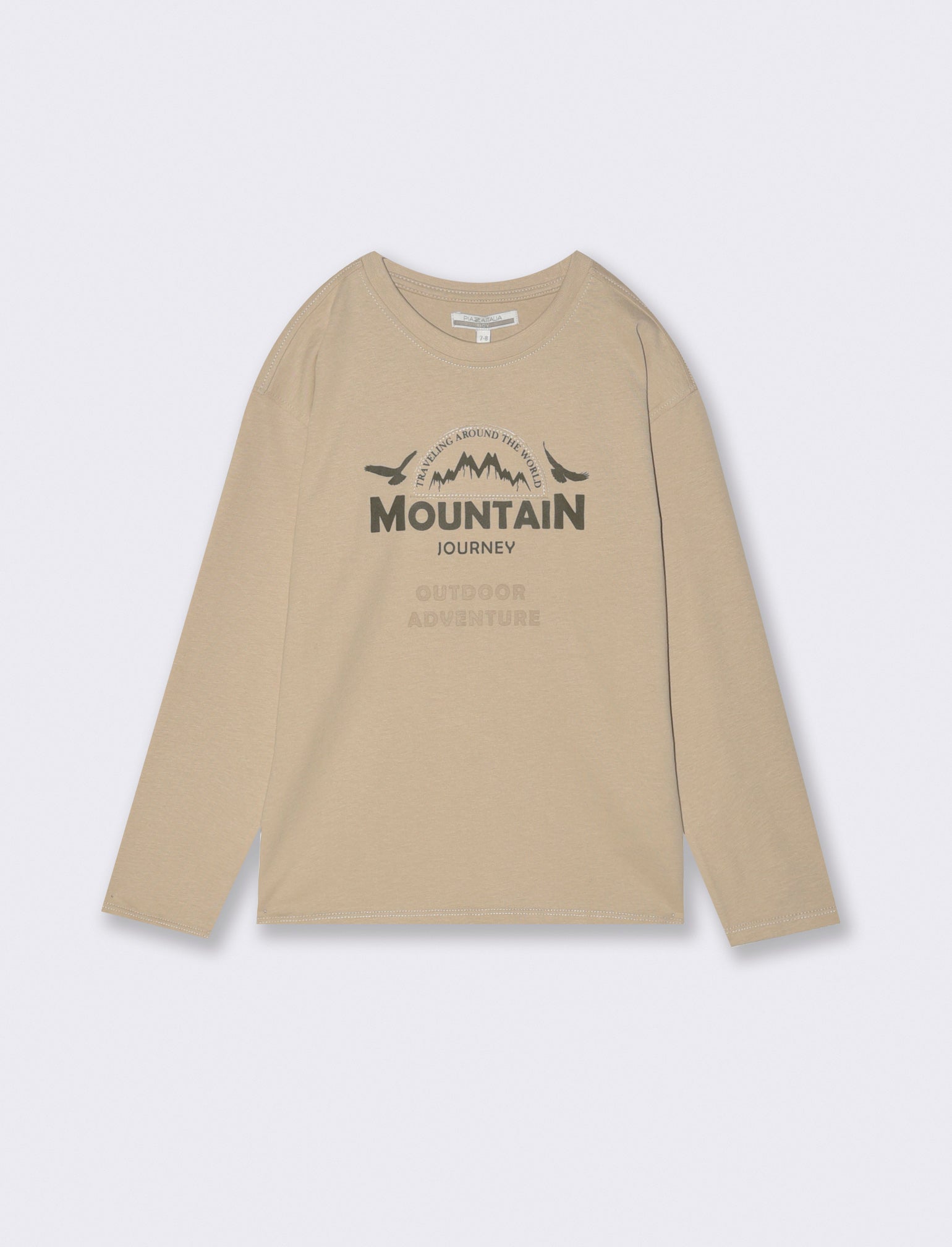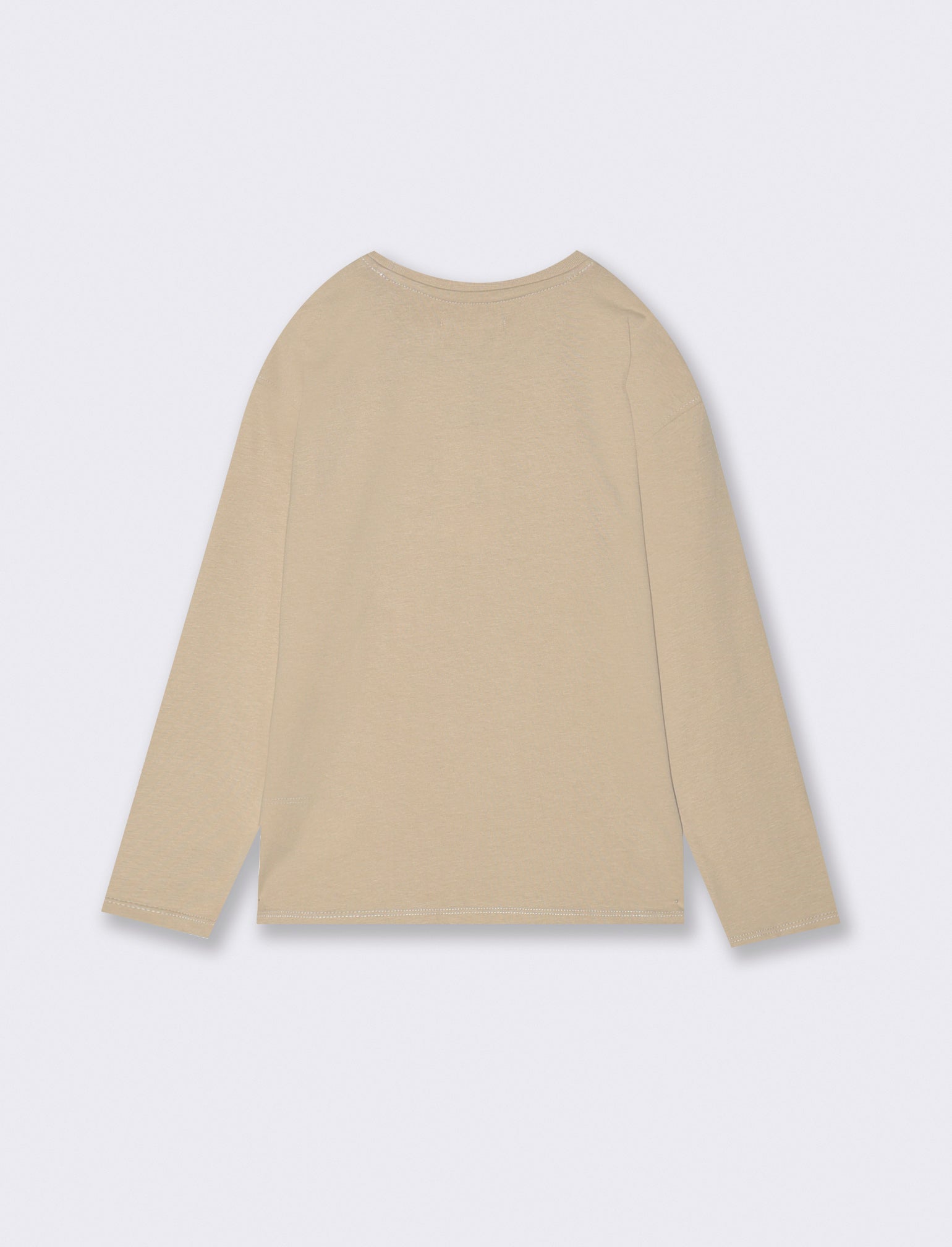 Maglietta in cotone mano calda con stampa e patch applicato frontali, modello girocollo adatto al tempo libero. Il prodotto è di colore Beige