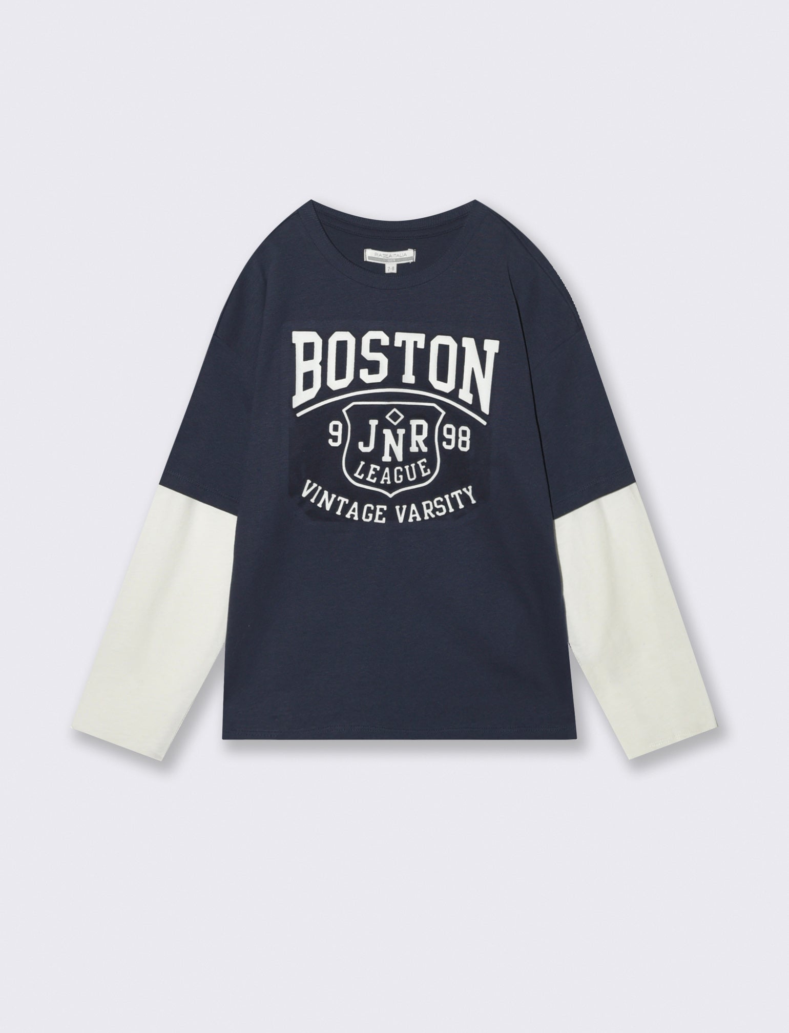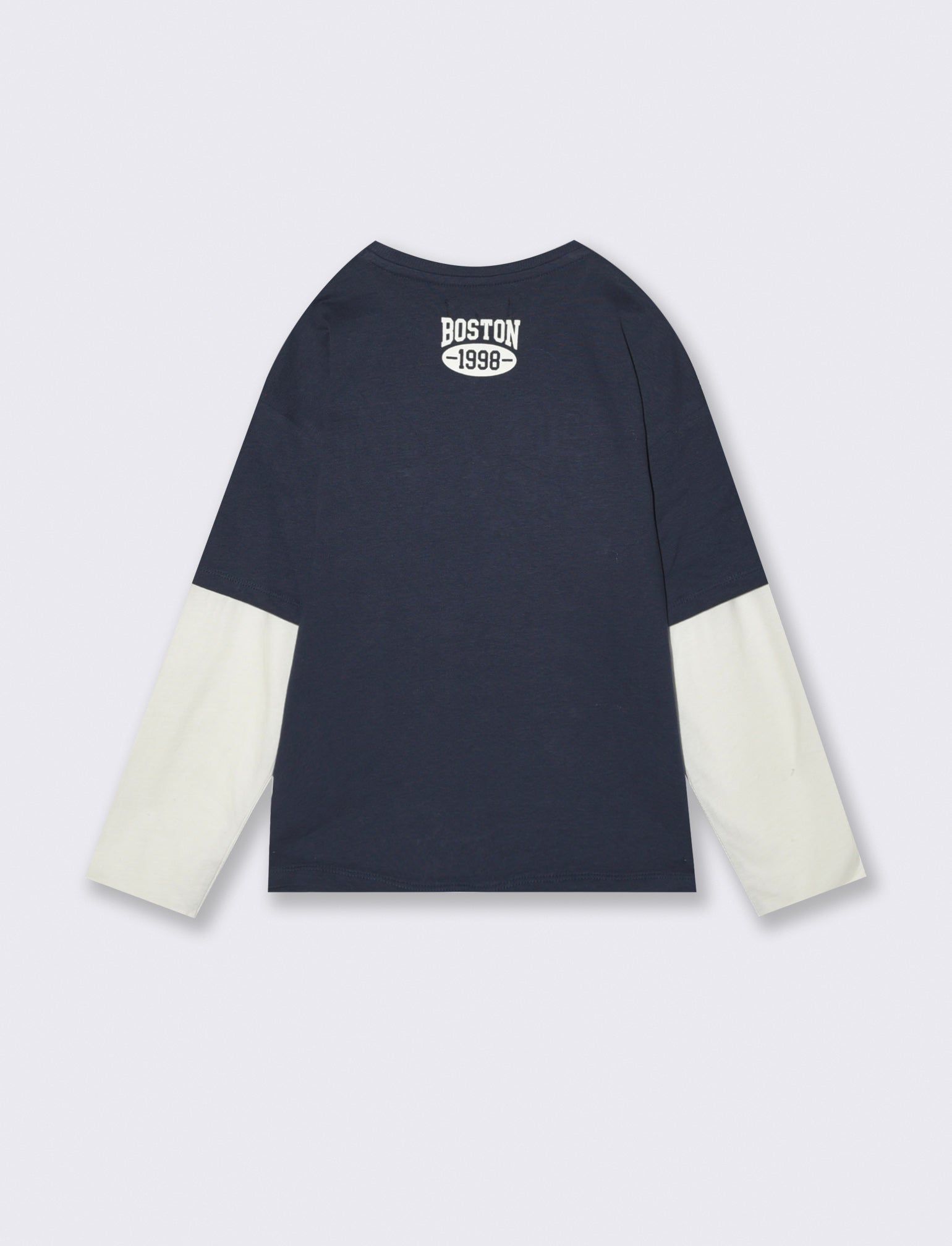 T-shirt in jersey di cotone, girocollo e maniche lunghe, con corpo blu e maniche bianche, per un effetto doppia manica. Il capo presenta un ricamo frontale. Vestibilità regular e comoda. Ottima per ogni occasione informale e tempo libero. Il prodotto è di colore Blu
