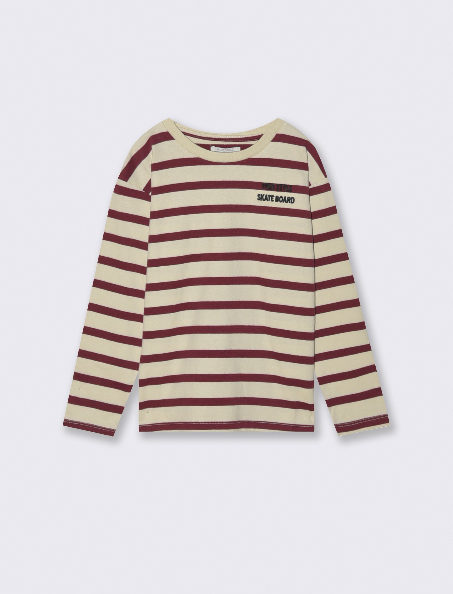 T-shirt in cotone mano calda maniche lunghe fantasia rigata con ricamo sul davanti, modello girocollo adatto al tempo libero. Il prodotto è di colore Righe