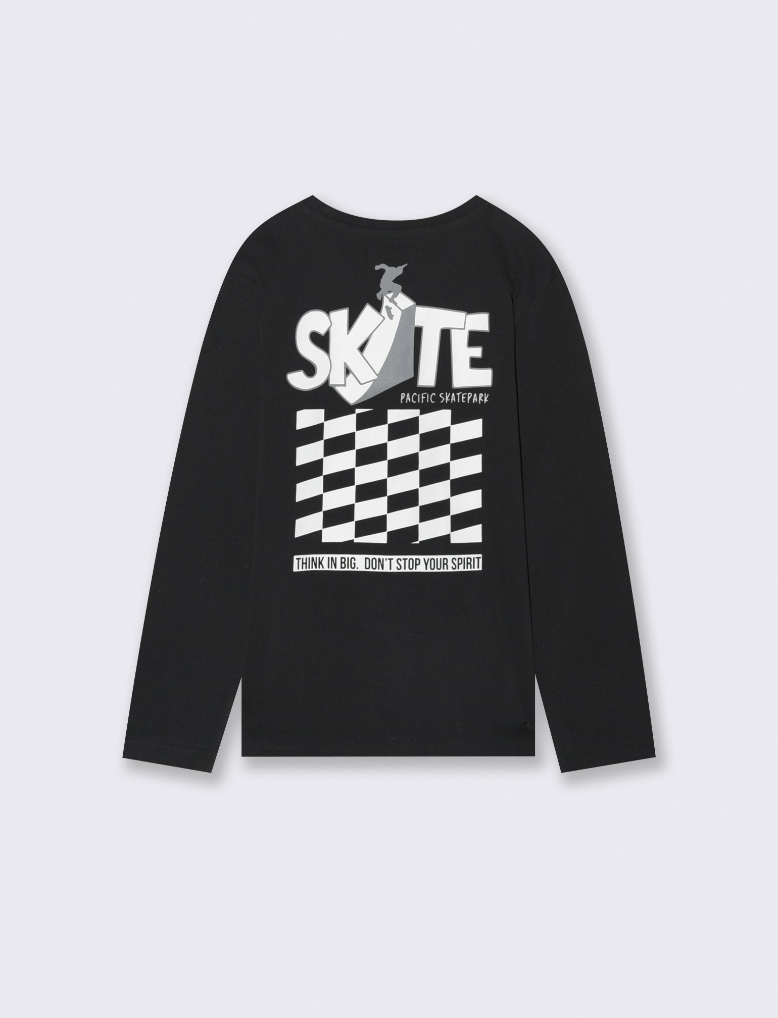T- shirt in jersey peach manica lunga. Scollo e fondo manica in costina. Stampa frontale e stampa maxi sul dietro. Ideale per il tempo libero. Il prodotto è di colore Nero