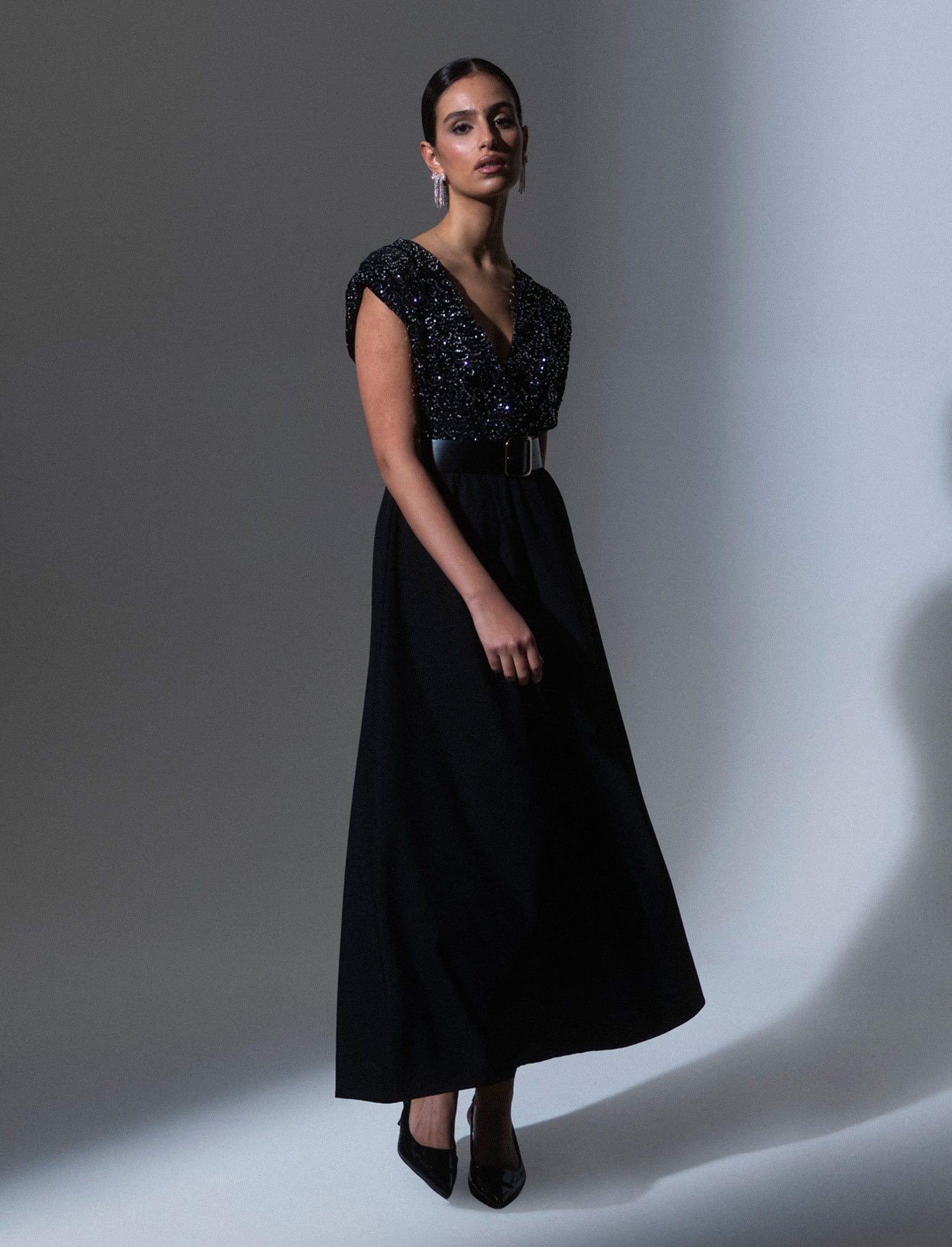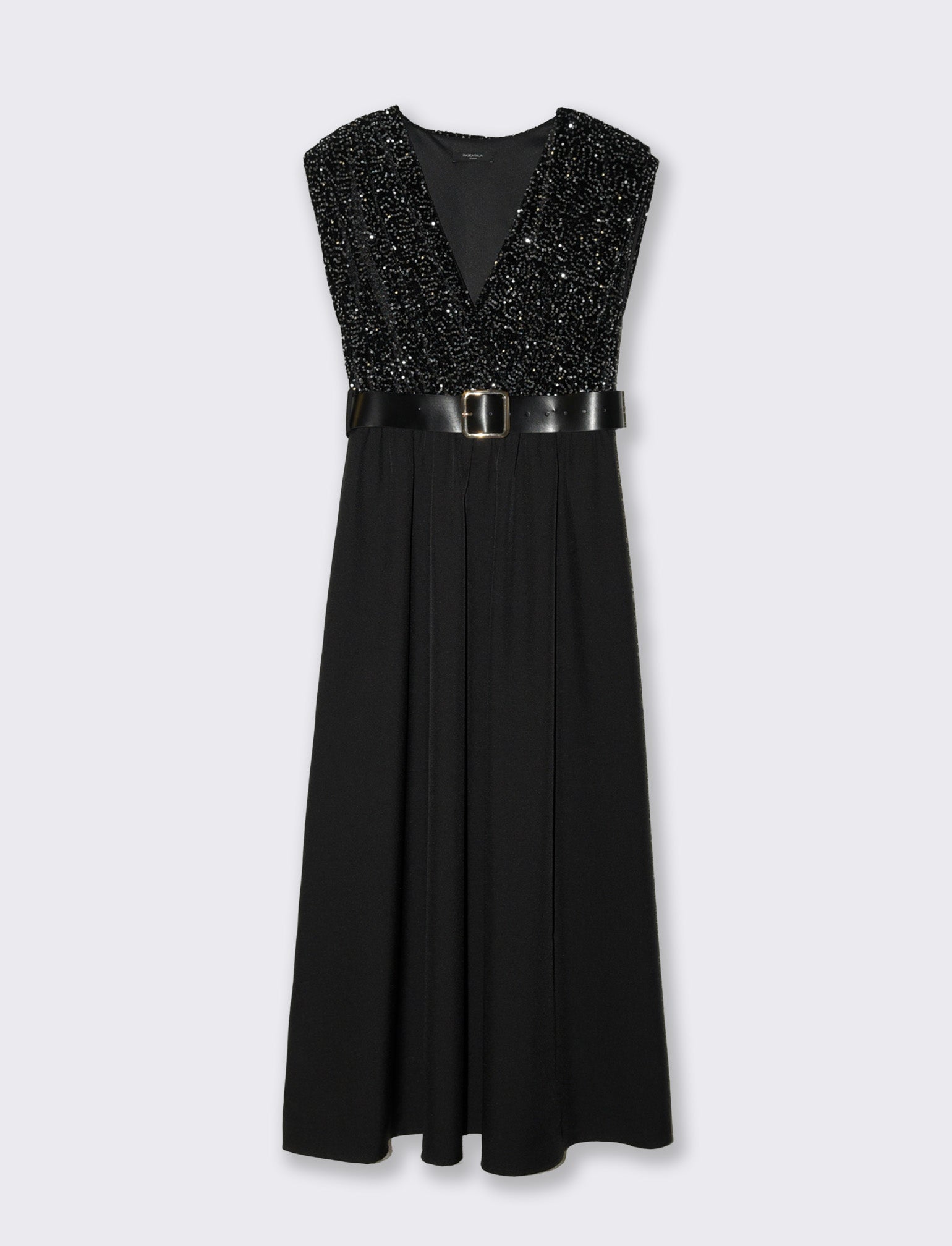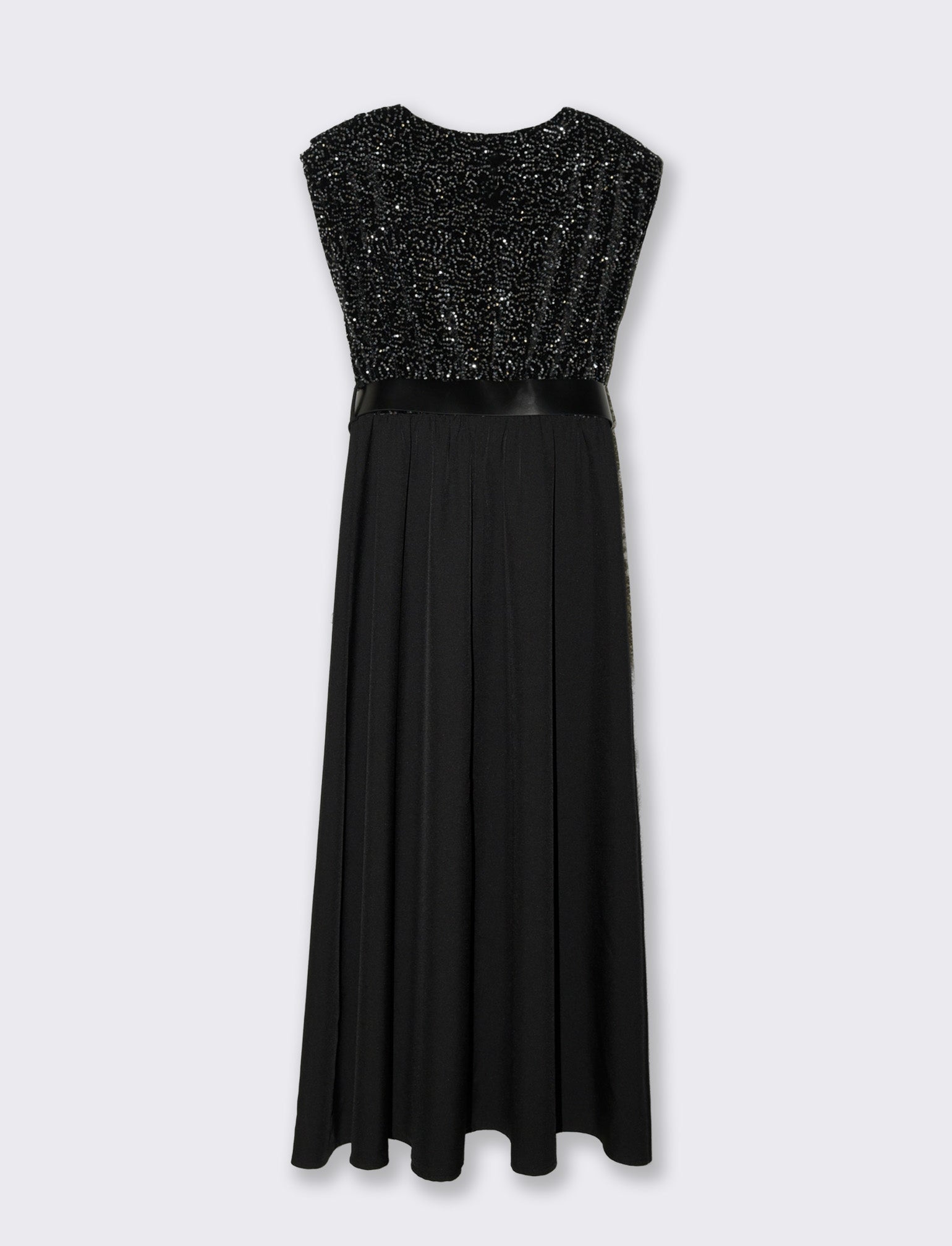 Vestito con doppio tessuto e cintura, paillettes e tessuto unito Il prodotto è di colore Argento