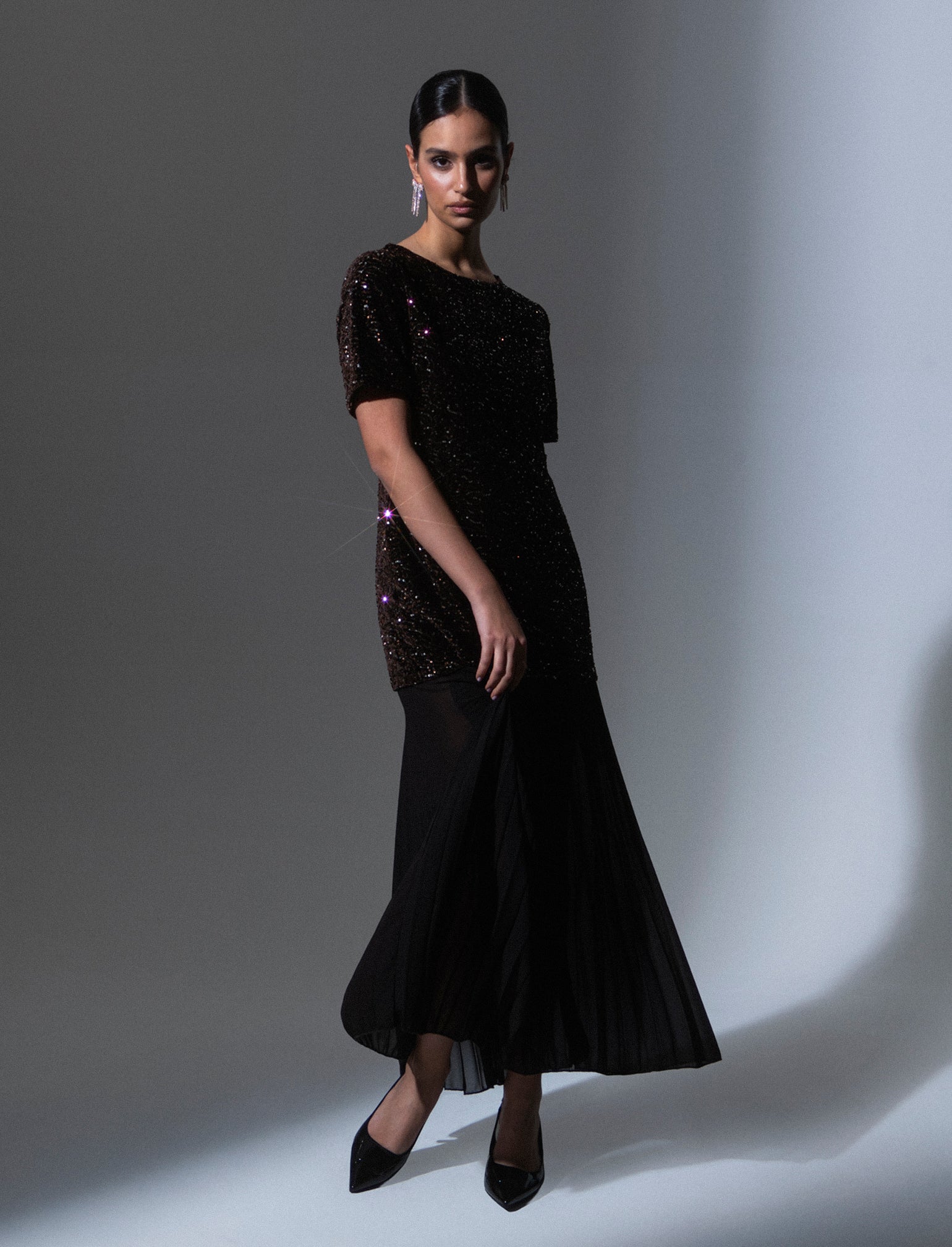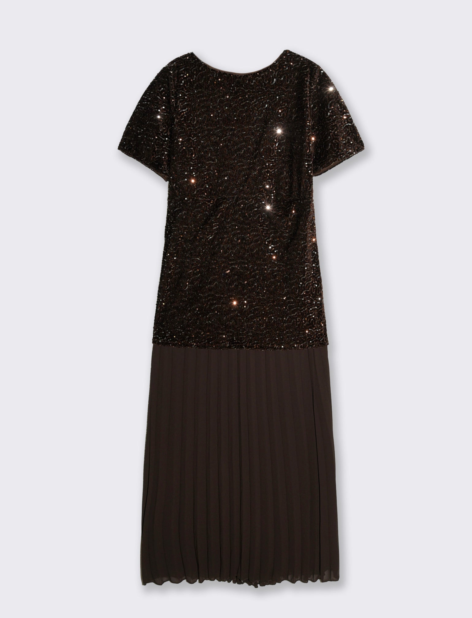 Vestito con maniche corte in paillettes e georgette plisset Il prodotto è di colore Moro