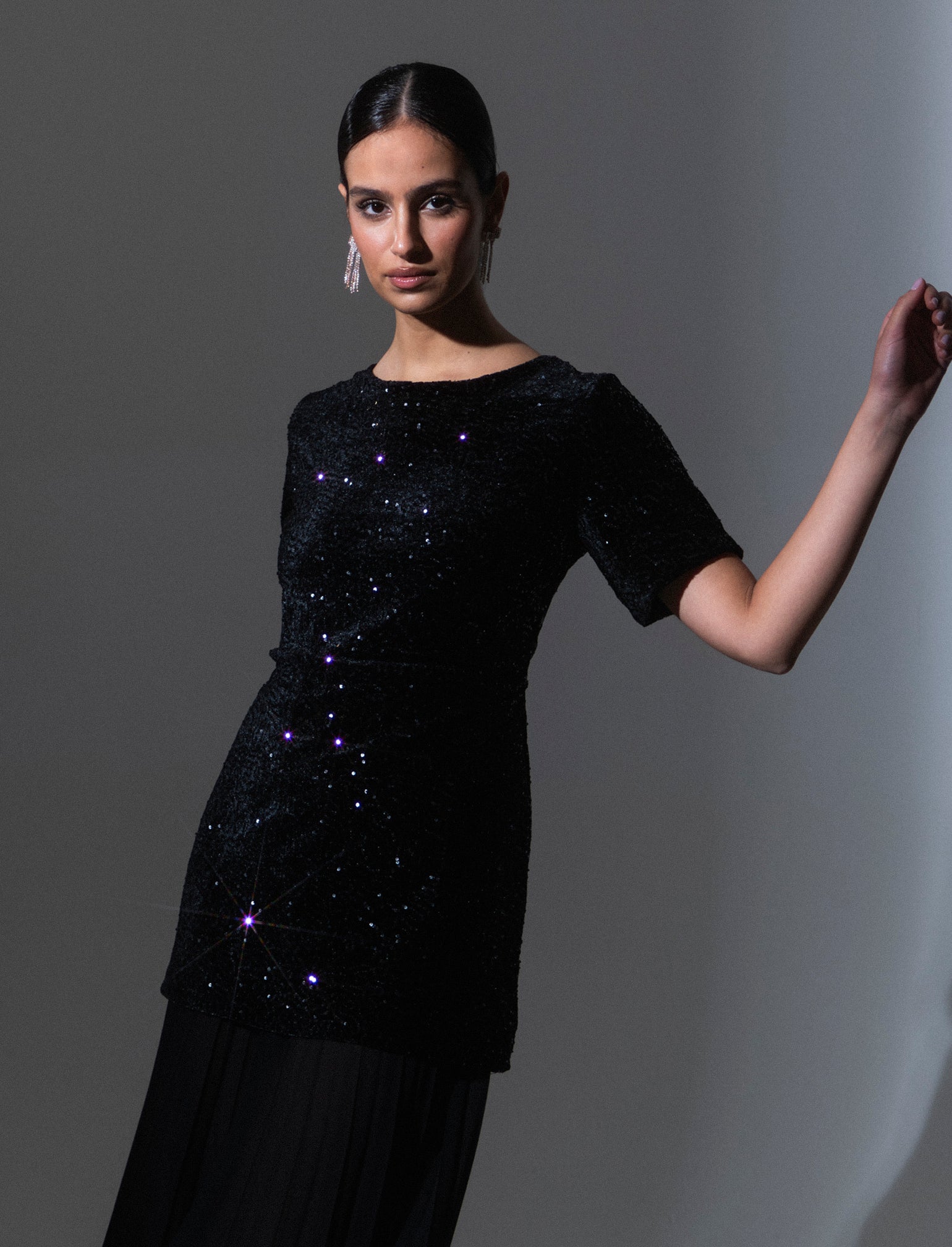 Vestito con maniche corte in paillettes e georgette plisset Il prodotto è di colore Nero