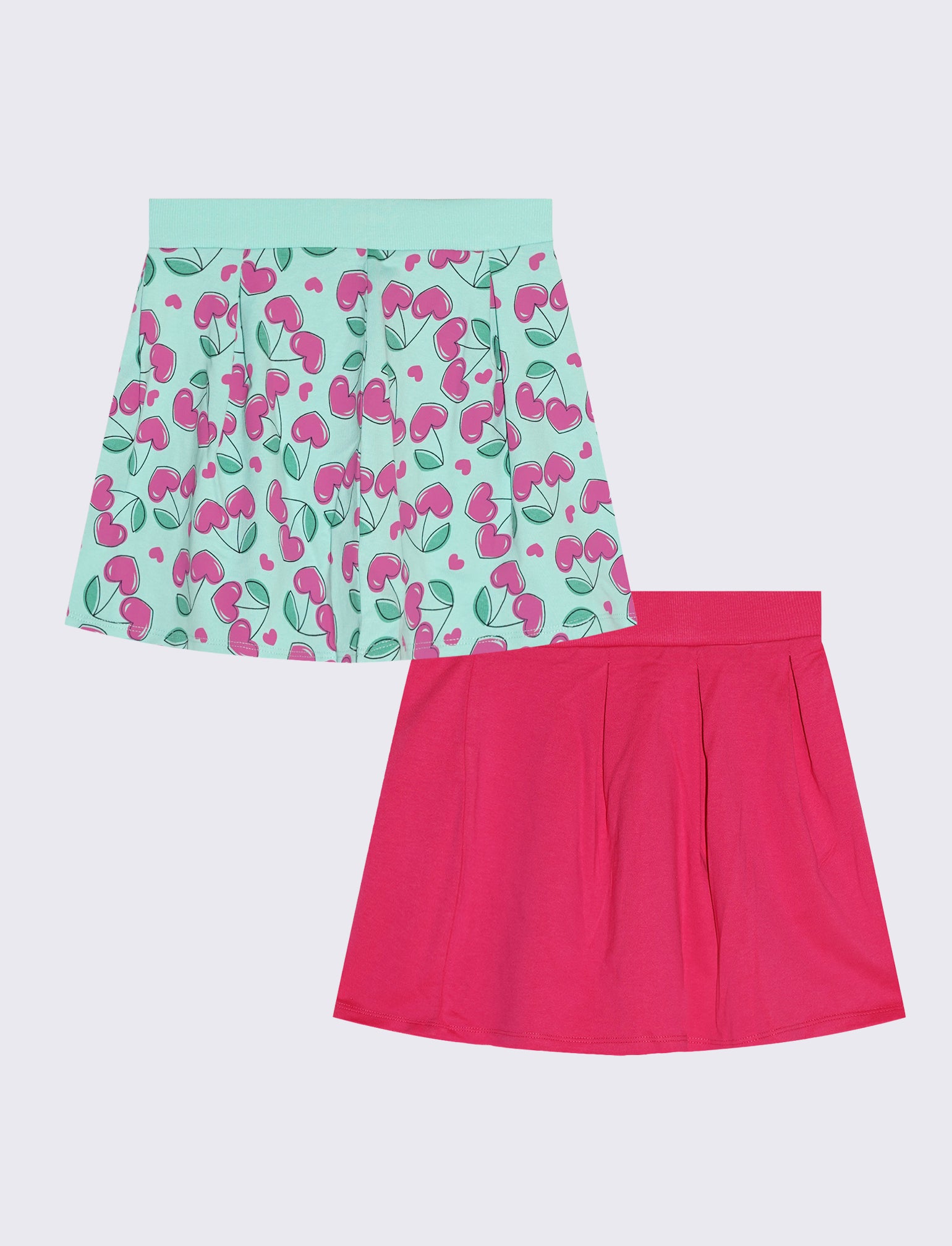 2 pack gonna con pieghe baciate, in morbido frech terry con vita elasticizzata, una variante tinta unita e l'altra stampata. Il prodotto è di colore Fuxia