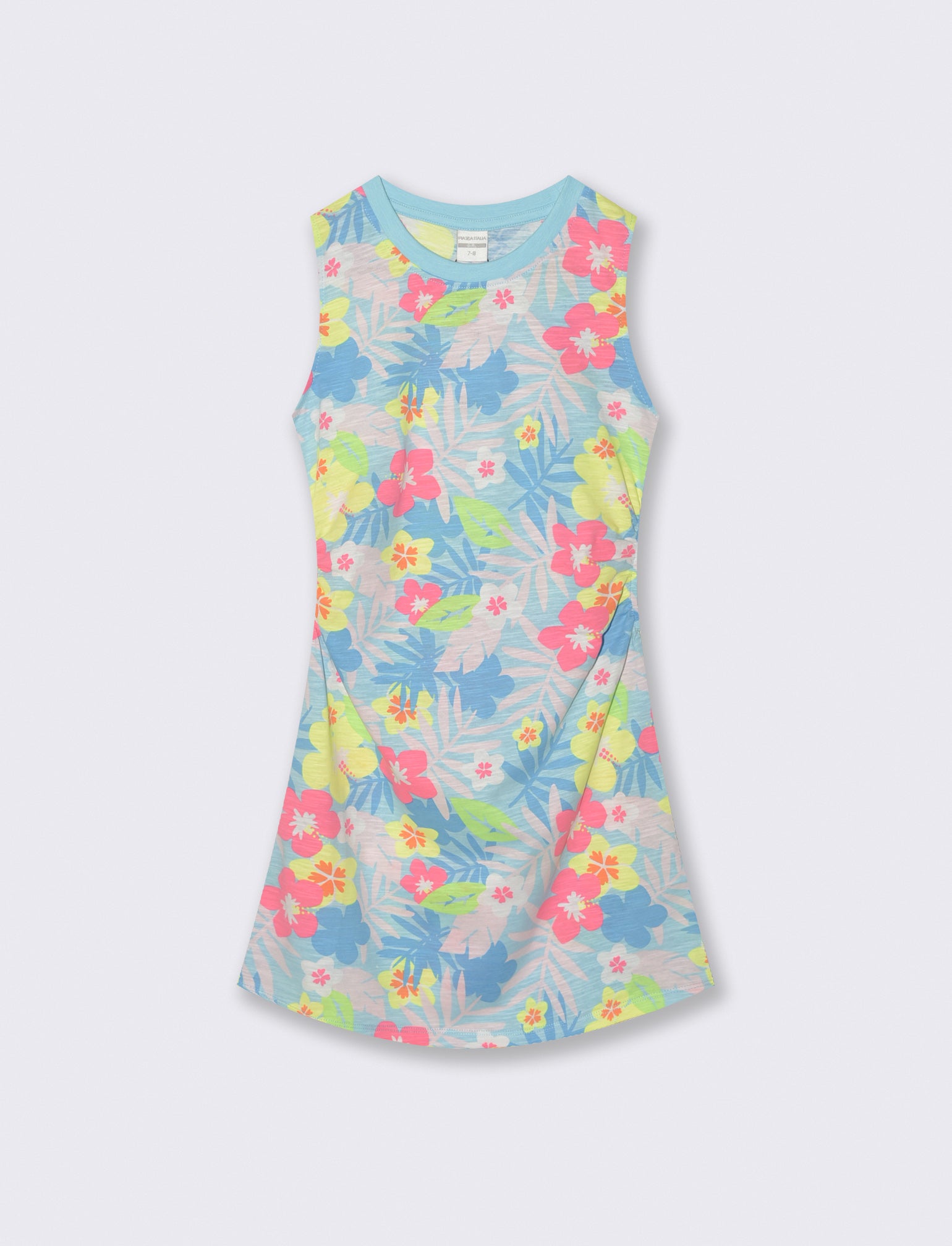 Vestito stampato in jersey 100% cotone con scollo rotondo in costina. Aperture cut out laterali per un look allamoda. Il prodotto è di colore Fantasia