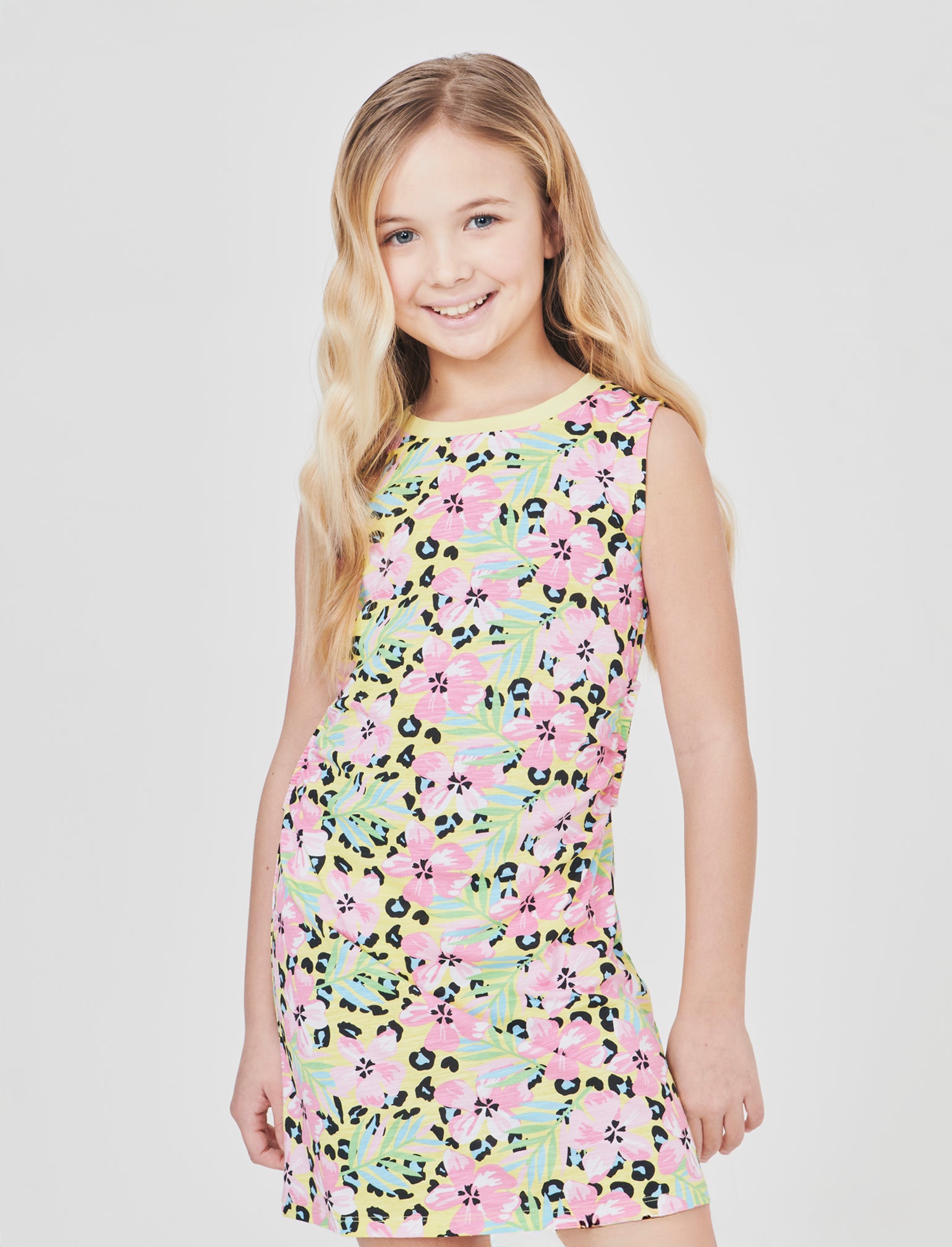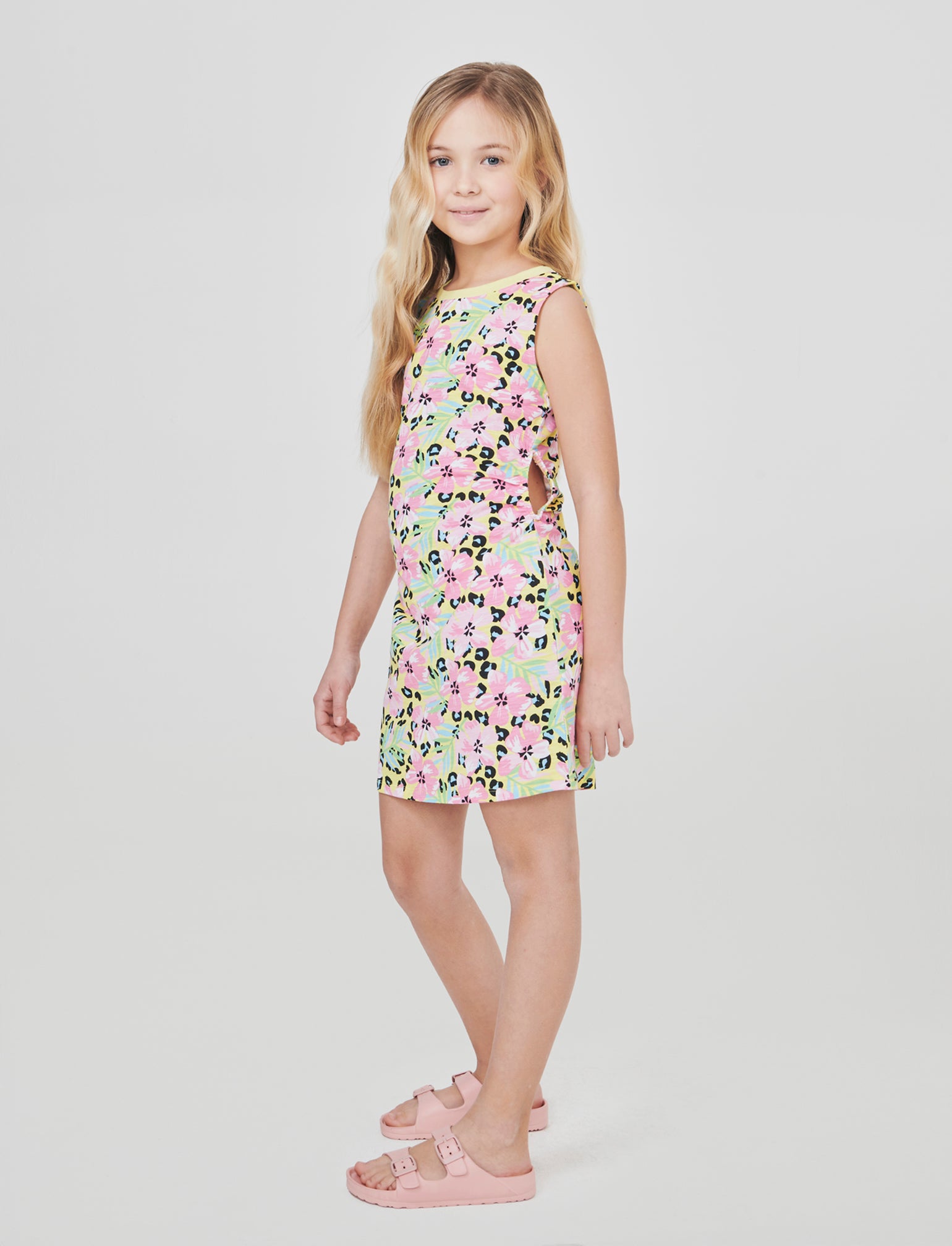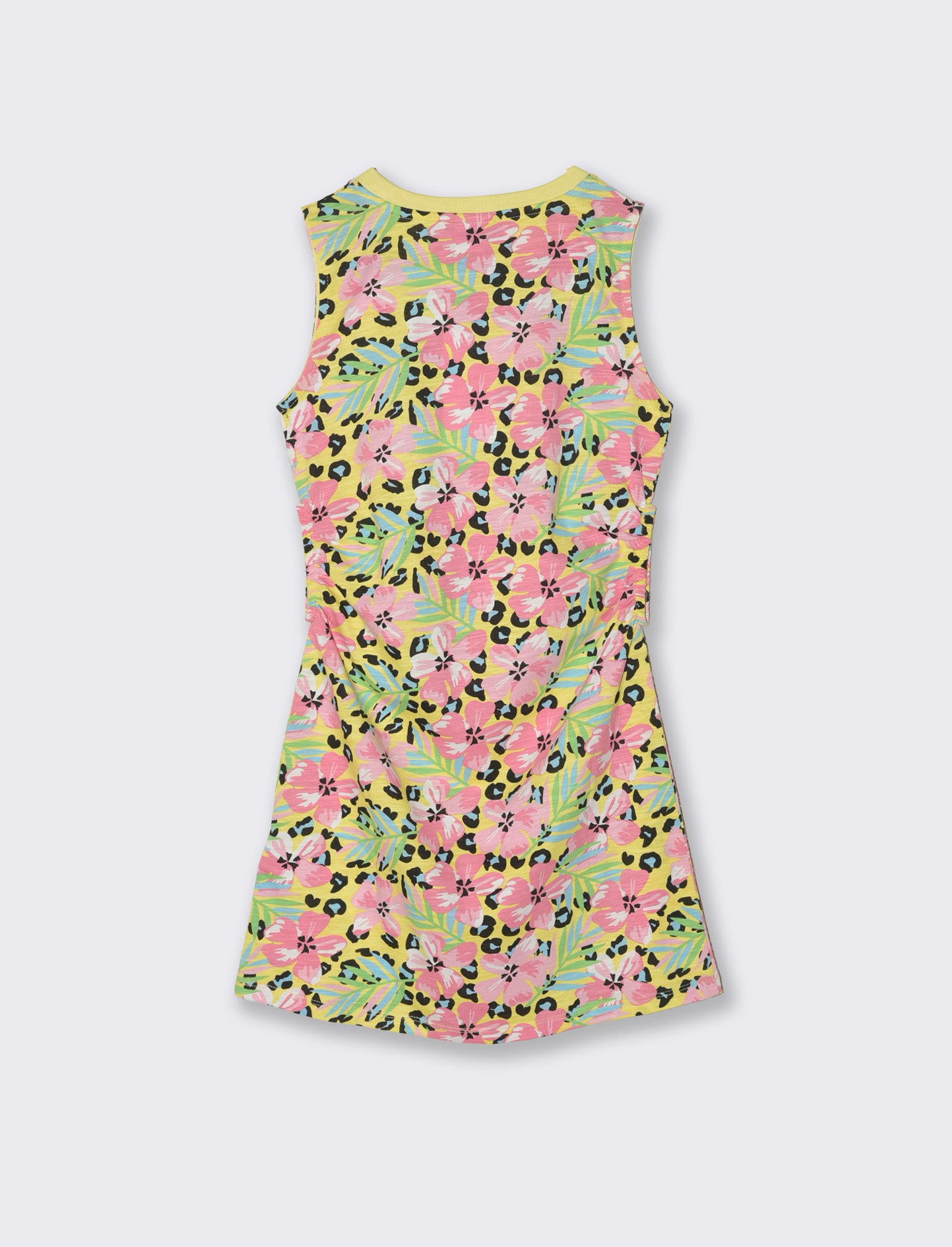 Vestito stampato in jersey 100% cotone con scollo rotondo in costina. Aperture cut out laterali per un look allamoda. Il prodotto è di colore Giallo