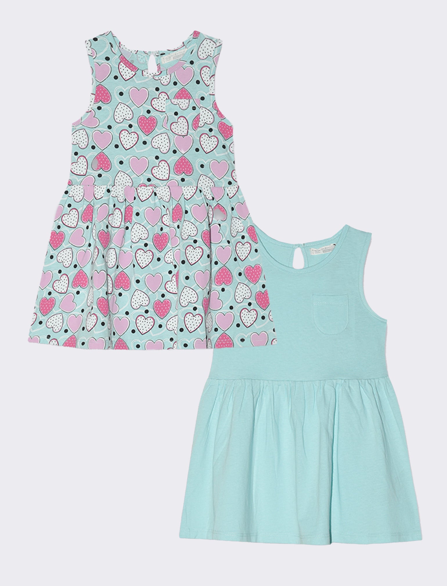 L'abito bipack per neonate è un delizioso set composto da due pezzi, perfetto per ogni occasione. Il primo capo, in tinta unita, presenta un grazioso taschino, mentre il secondo è caratterizzato da una vivace fantasia che aggiunge un tocco di allegria. Entrambi gli abiti sono dotati di giromanica e arriccio in vita, garantendo comfort e libertà di movimento. Ideale per far brillare la tua piccola in ogni momento della giornata. Il prodotto è di colore Verde acqua