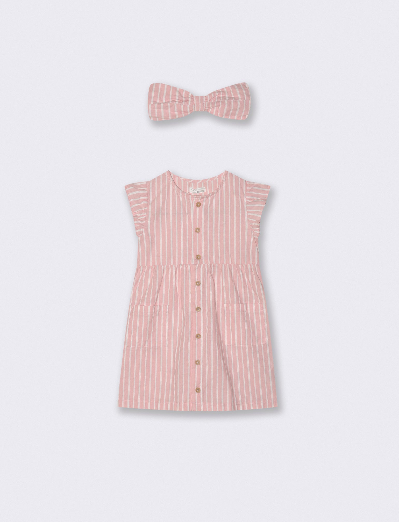 Abito in cotone a righe, con tasche frontali e bottoni, completo di accessorio per capelli a forma di fiocco Il prodotto è di colore Righe
