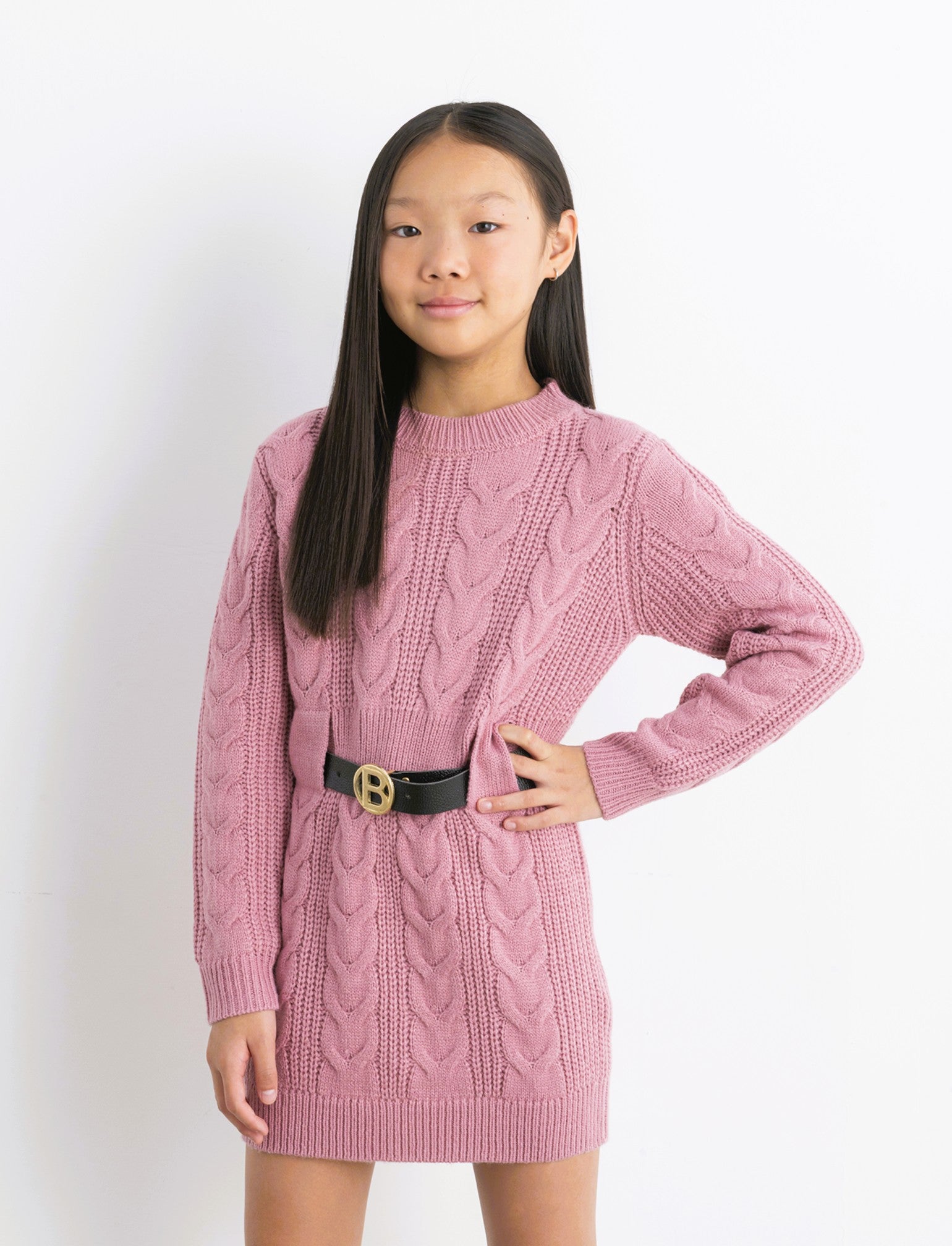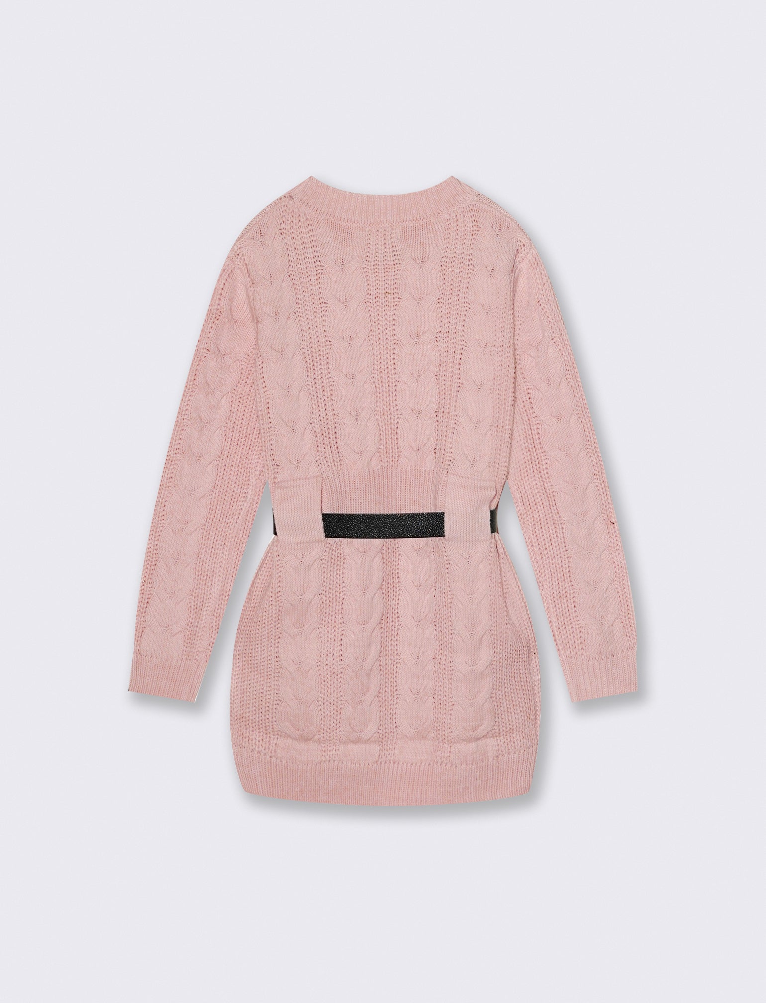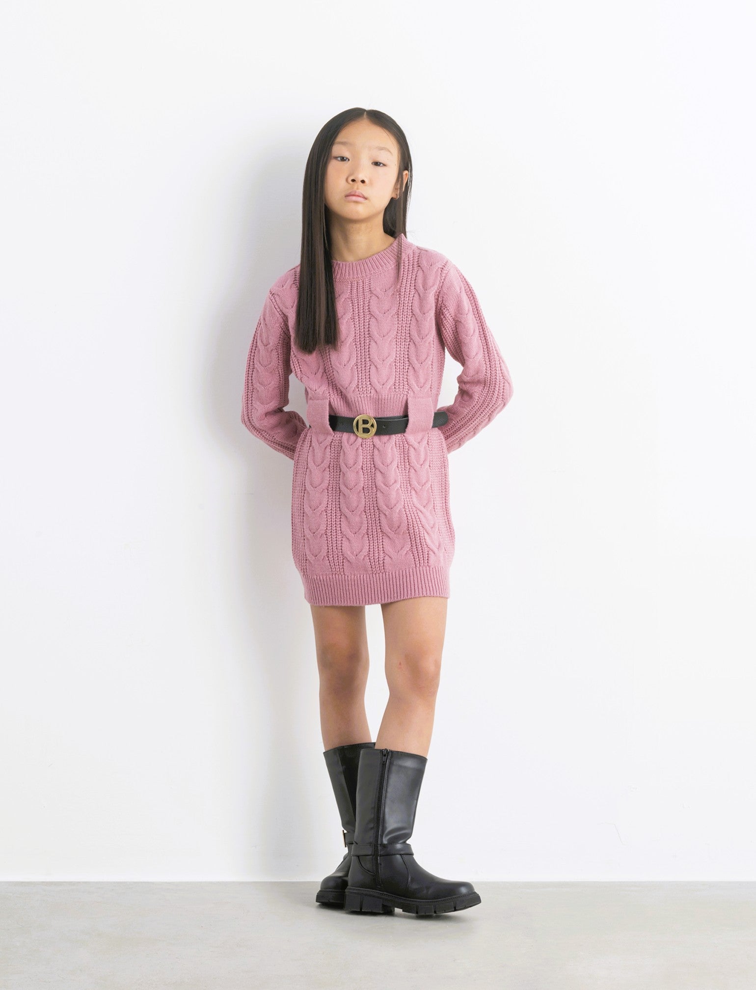 Abito in maglia mezzo collo da bambina con cintura e fibbia in metallo. Il prodotto è di colore Rosa cipolla