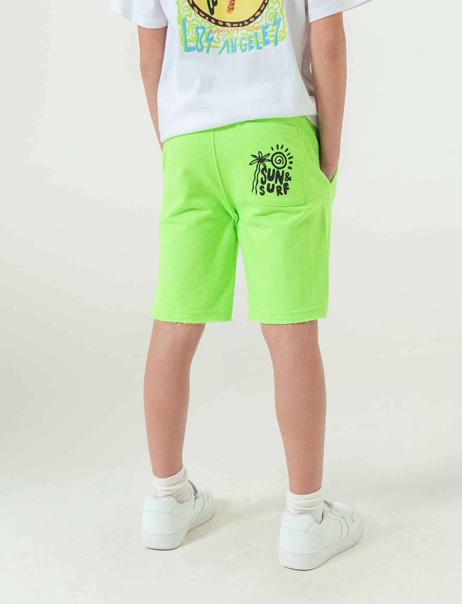 Il pantaloncino in felpa per bambini è realizzato in un morbido tessuto in poly-cotone, ideale per garantire comfort durante tutte le attività quotidiane. La vestibilità regular assicura libertà di movimento, mentre l'elastico in vita offre un'ottima aderenza. Le vivaci stampe colorate, presenti sia sul davanti che sul retro, aggiungono un tocco di allegria e originalità, rendendo questo pantaloncino perfetto per ogni avventura. Il prodotto è di colore Verde