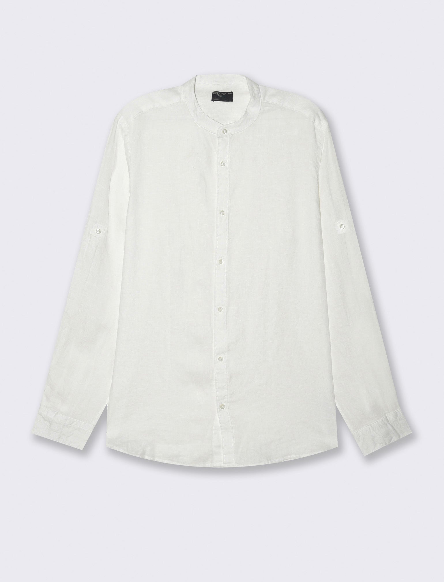 Camicia regular fit realizzata in tessuto leggero di puro lino, ideale per le giornate calde e soleggiate. Il collo coreano conferisce un tocco di eleganza informale, mentre le maniche lunghe, dotate di bottone sul polsino e alamaro, offrono un fit comodo e versatile. La chiusura frontale con abbottonatura completa il design, rendendo questa camicia perfetta per un look casual ma curato, adatta a diverse occasioni. Il prodotto è di colore Bianco