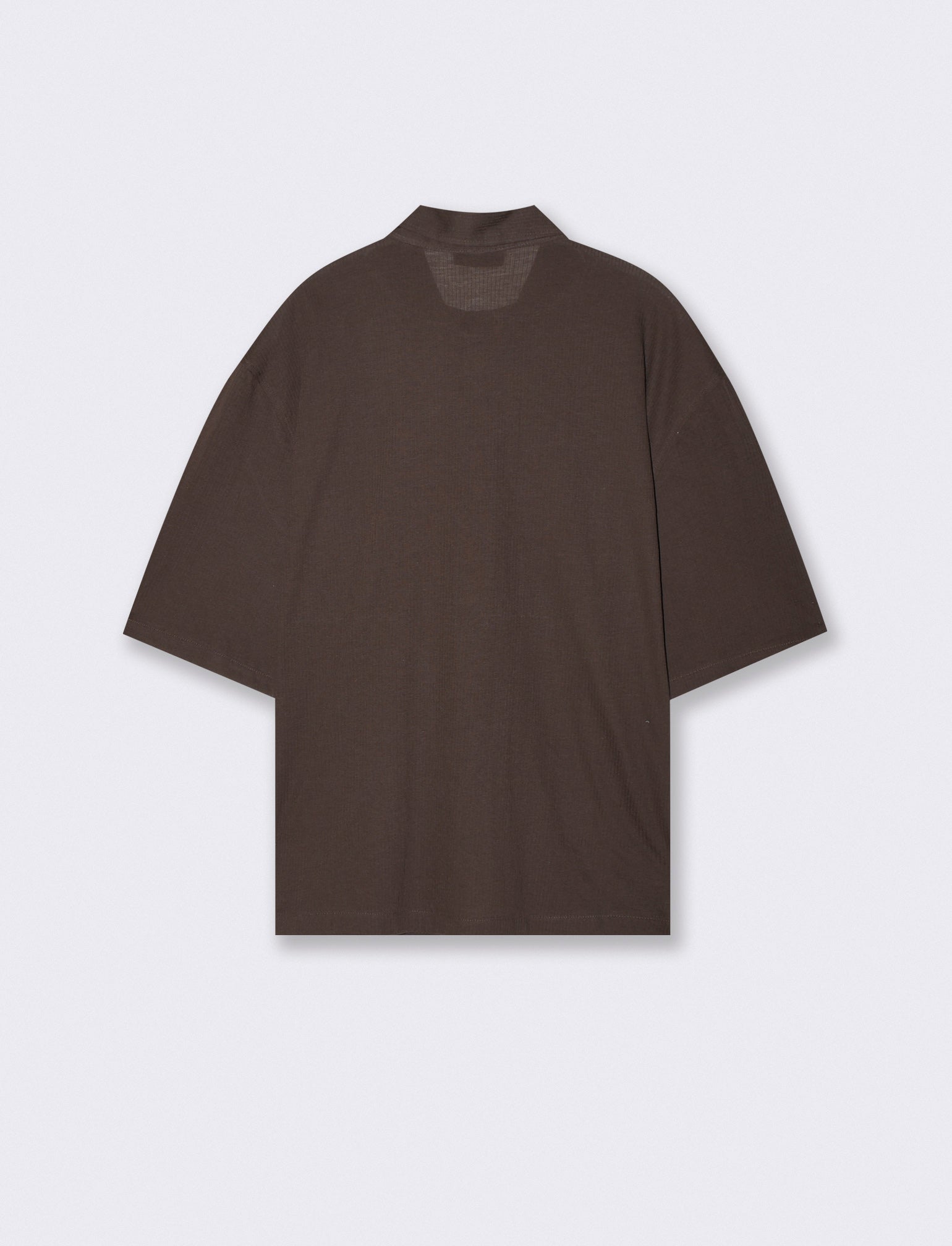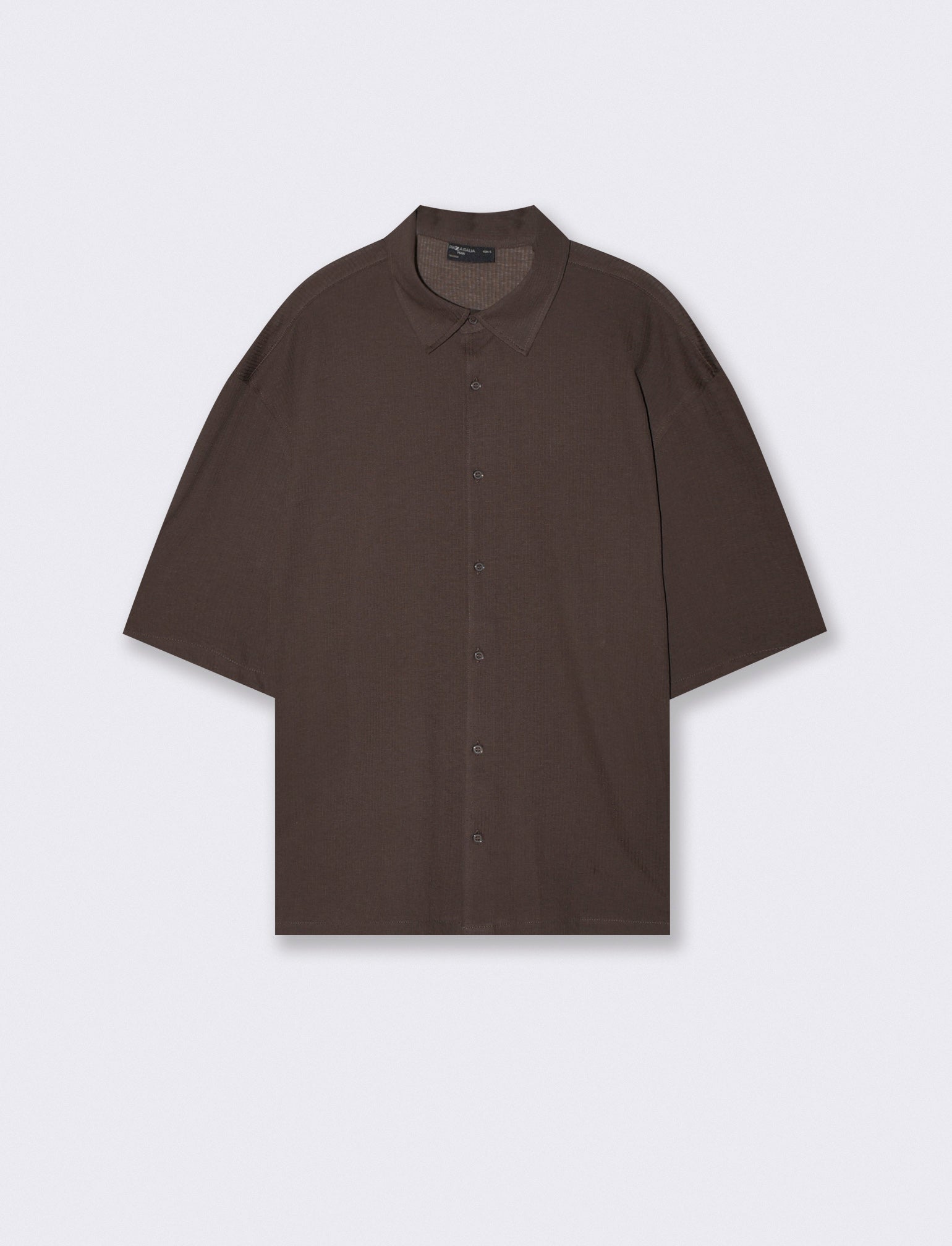 Camicia boxy fit realizzata in misto cotone jacquard a coste. Colletto havana e maniche corte. Chiusura frontale con abbottonatura a vista effetto legno. Il prodotto è di colore Moro