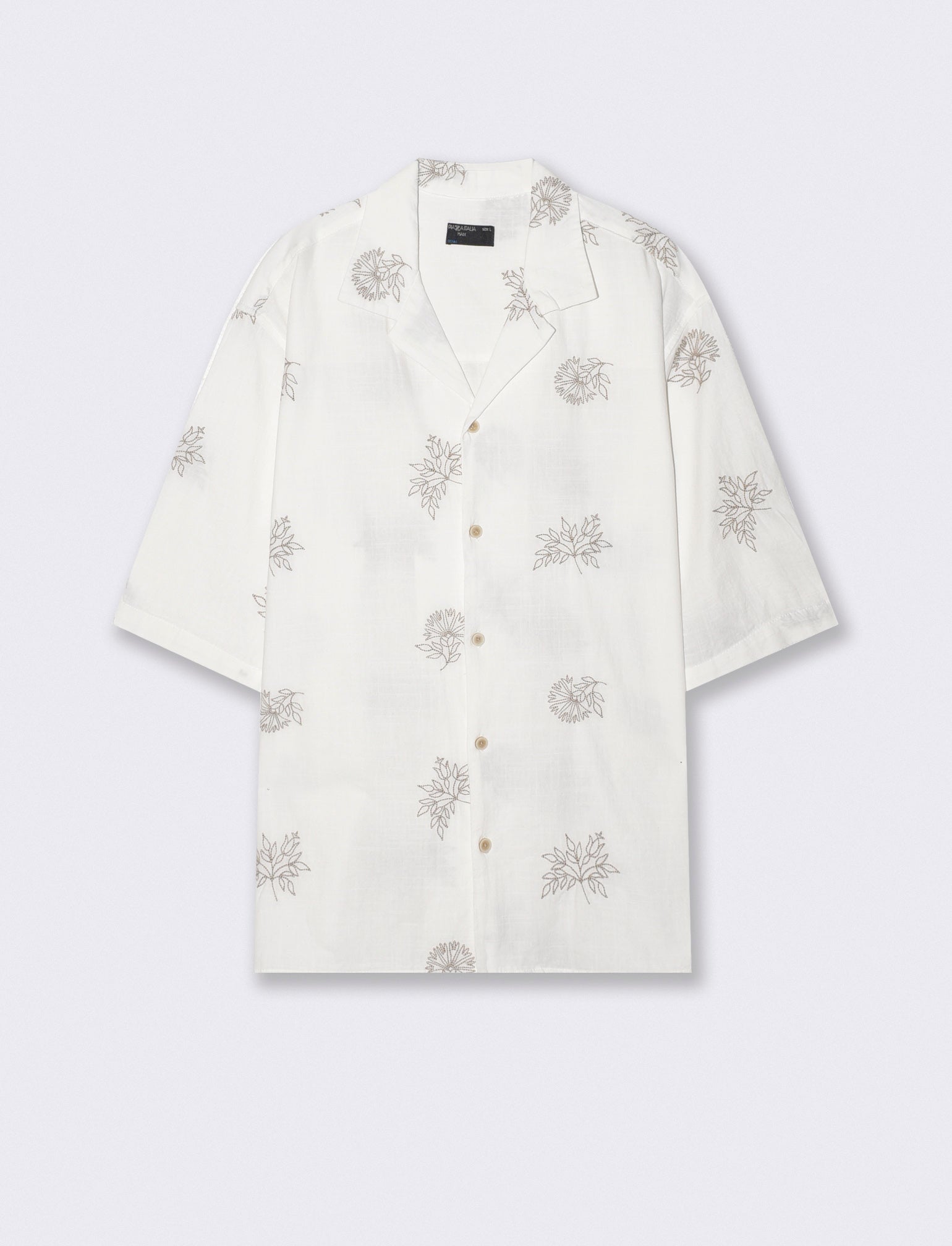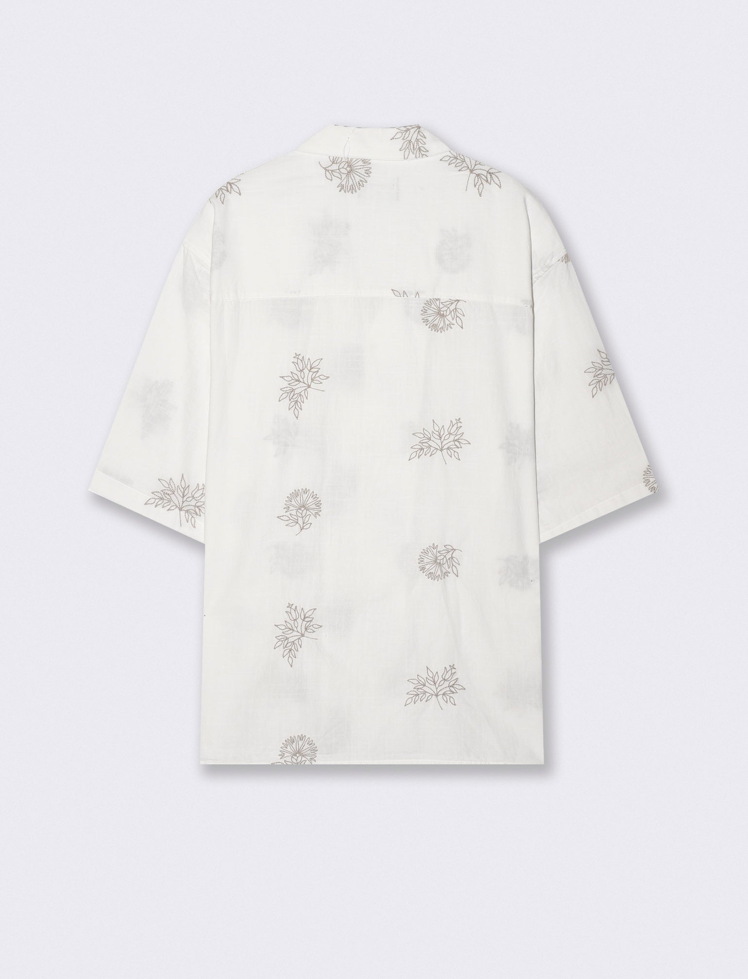 Camicia boxy fit realizzata in puro cotone fantasia ricamata. Disponibile in 4 varianti. Colletto havana e maniche corte. Chiusura frontale con abbottonatura a vista. Il prodotto è di colore Beige ecru
