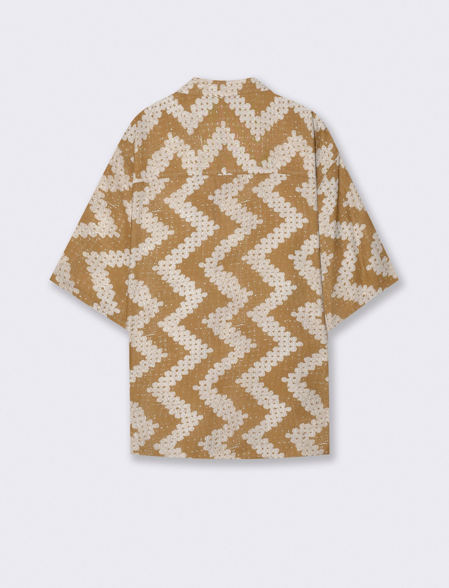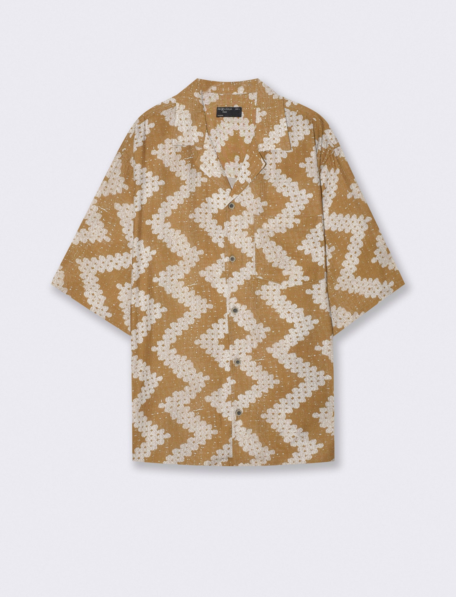 Camicia boxy fit realizzata in tessuto goffrato a fantasia. 3 opzioni di stampa. Colletto havana e maniche corte. Taschino sul petto. Chiusura frontale con abbottonatura a vista. Il prodotto è di colore Cammello