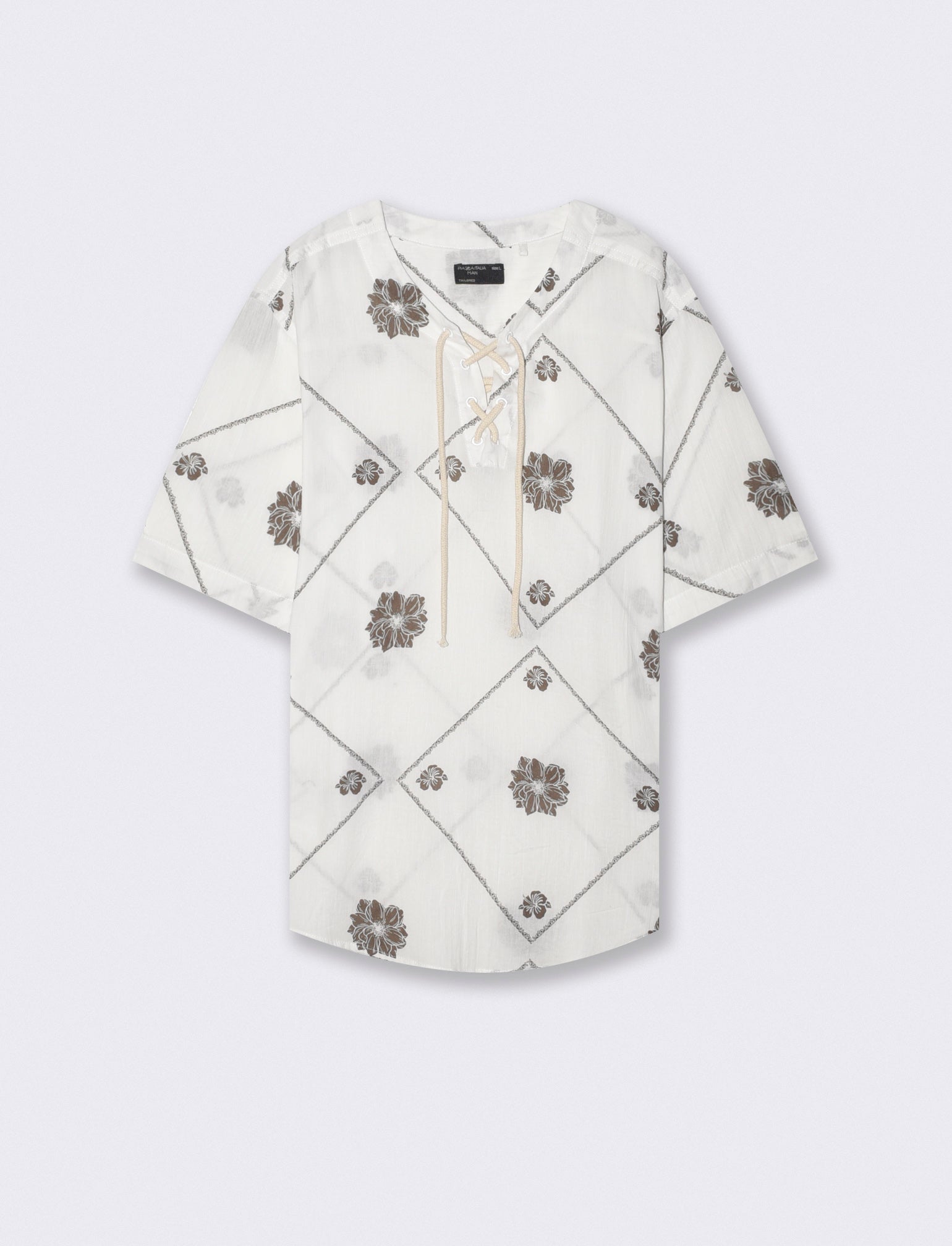 Casacca relaxed fit realizzata in tessuto di cotone effetto crepe. Fantasia stampata all over. Collo coreano e maniche corte. Abbottonatura con laccetti. Il prodotto è di colore Bianco