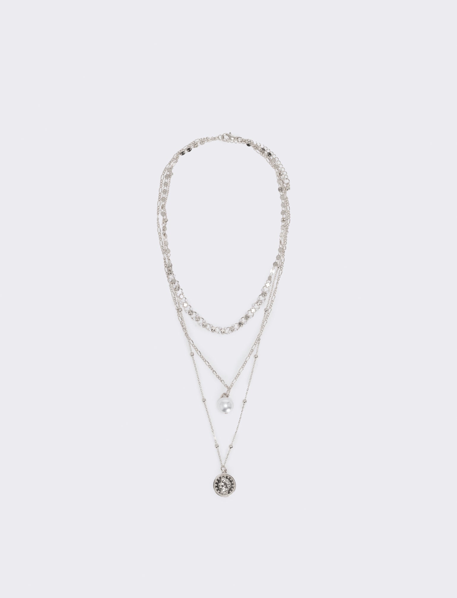 Collana tre fili con perla e monetina Il prodotto è di colore Argento