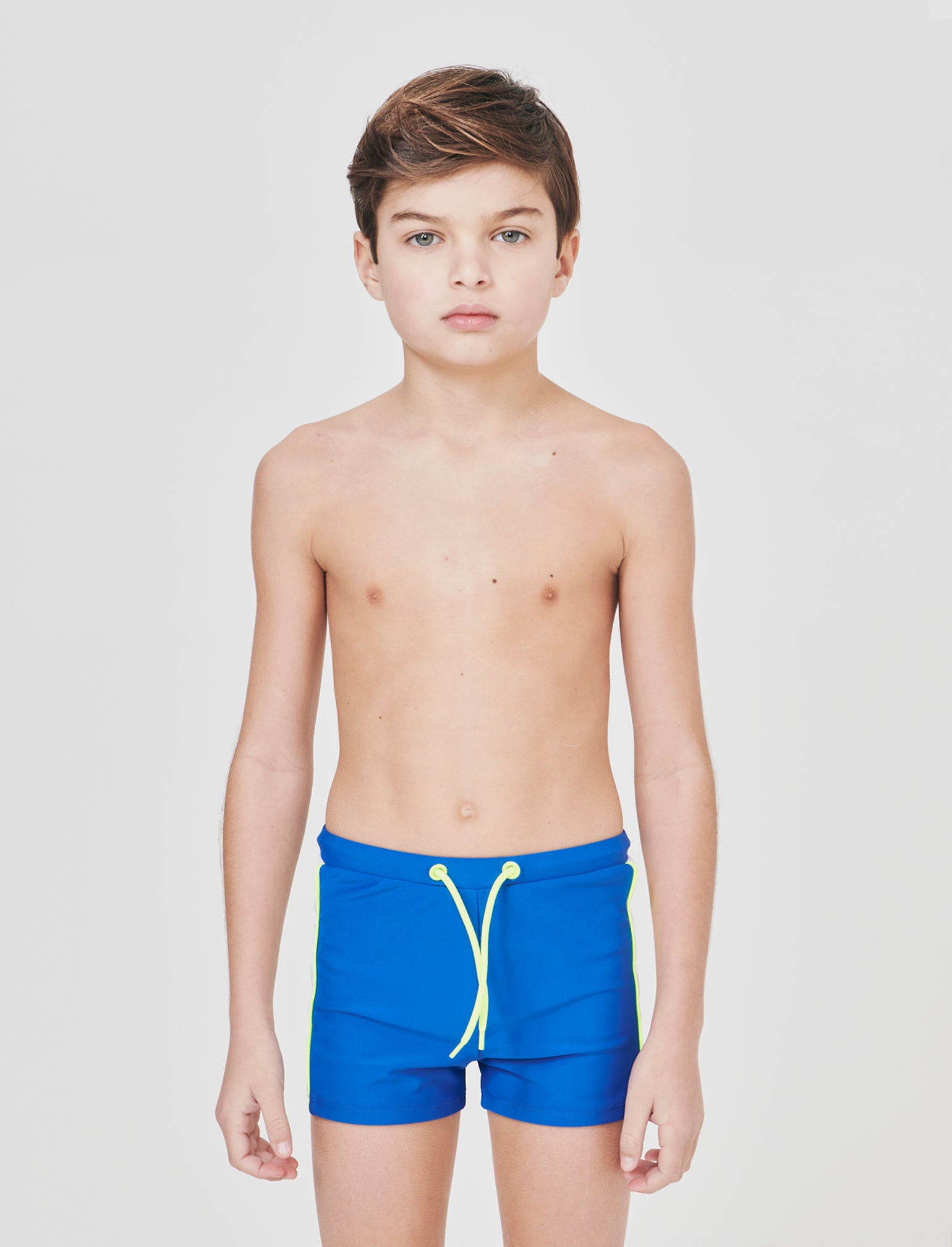 Costume boxer in tessuto elastico con coulisse in vita, laccio fluo e bandina laterale con stampa. Il prodotto è di colore Blu oceano