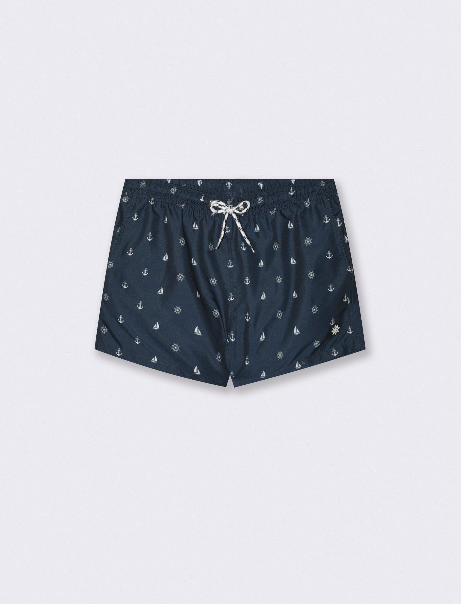 Costume realizzato in tessuto tecnico. Fantasia stampata a contrasto. Vita elasticizzata regolabile con laccio. Tasche laterali. Fodera rete interna. Dettaglio di tasca applicata dietro. Patch in gomma sul davanti. Il prodotto è di colore Blu