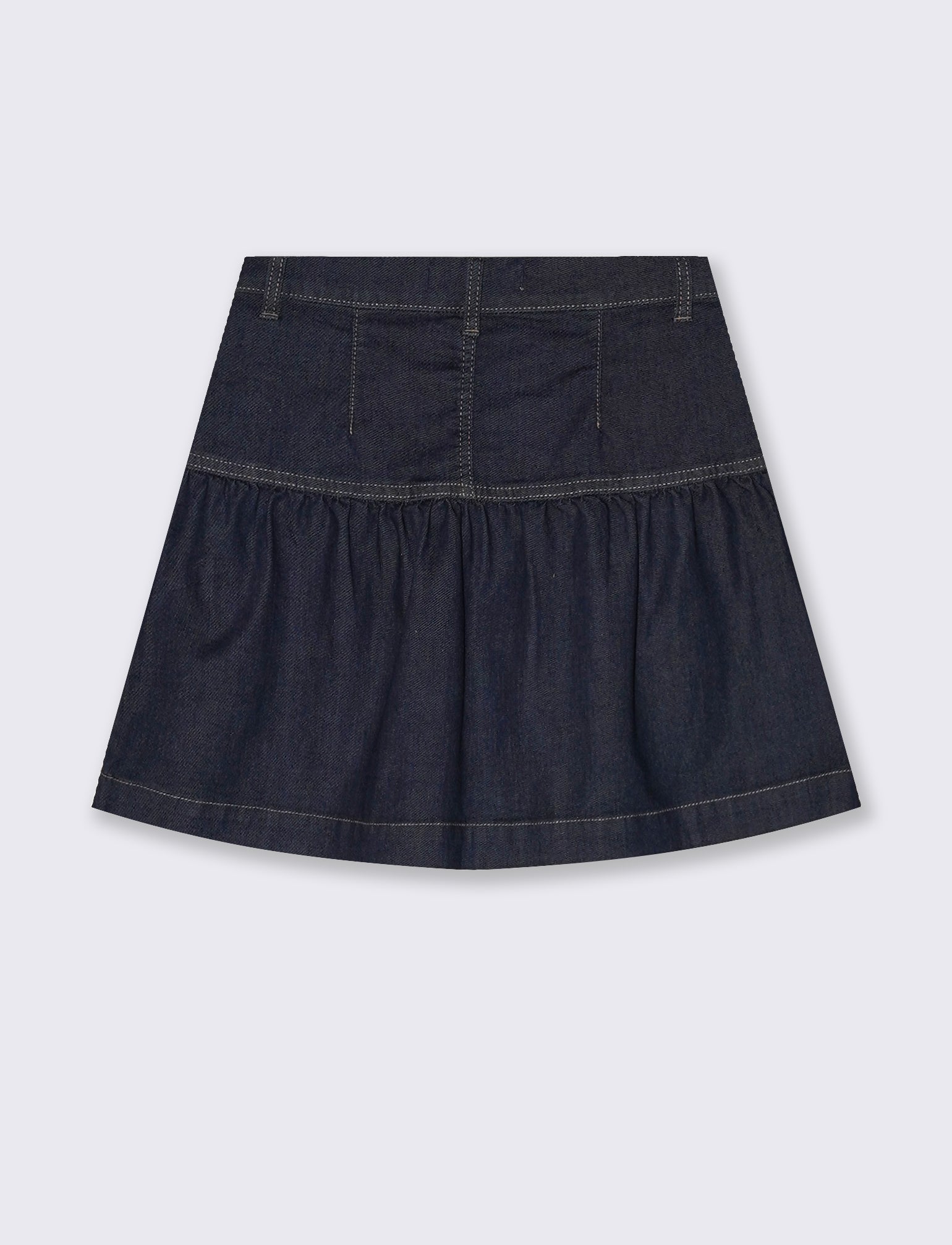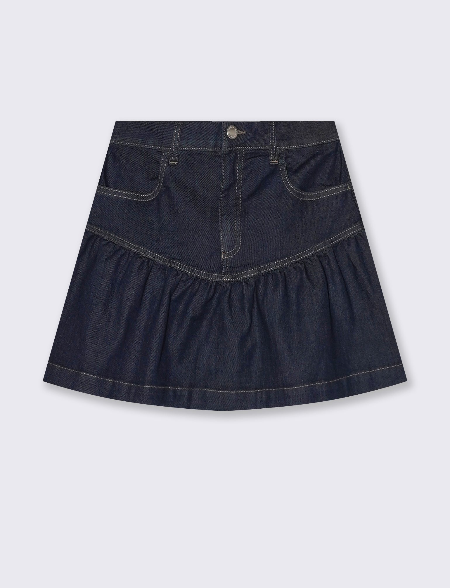MINI SKIRT CON VOLANT E TAGLIO A V ARRICCIATO SUL BACINO. Il prodotto è di colore DENIM SCURO