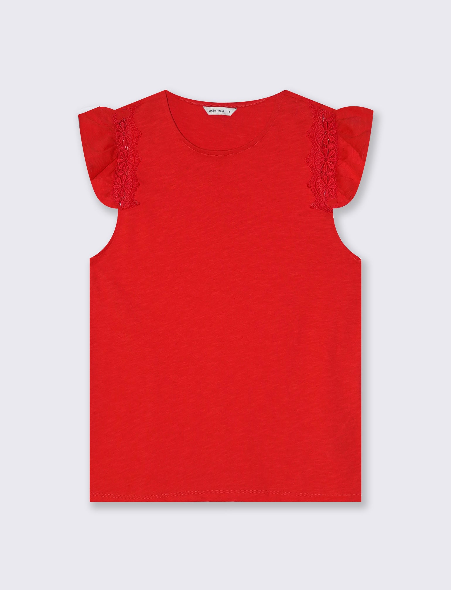 MAGLIA CON SCOLLO ROTONDO E MANICHE AD ALETTA, CON DETTAGLIO IN PIZZO SULLE MANICHE. Il prodotto è di colore Corallo