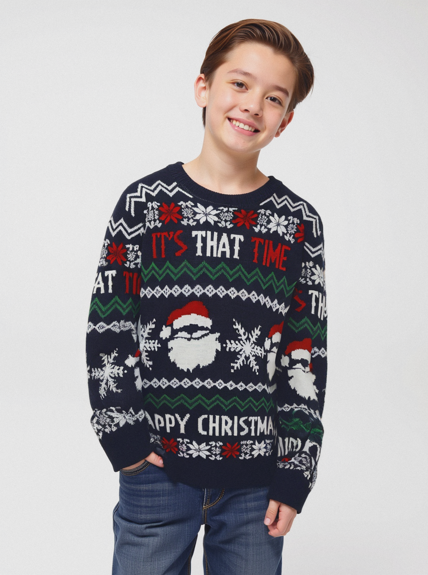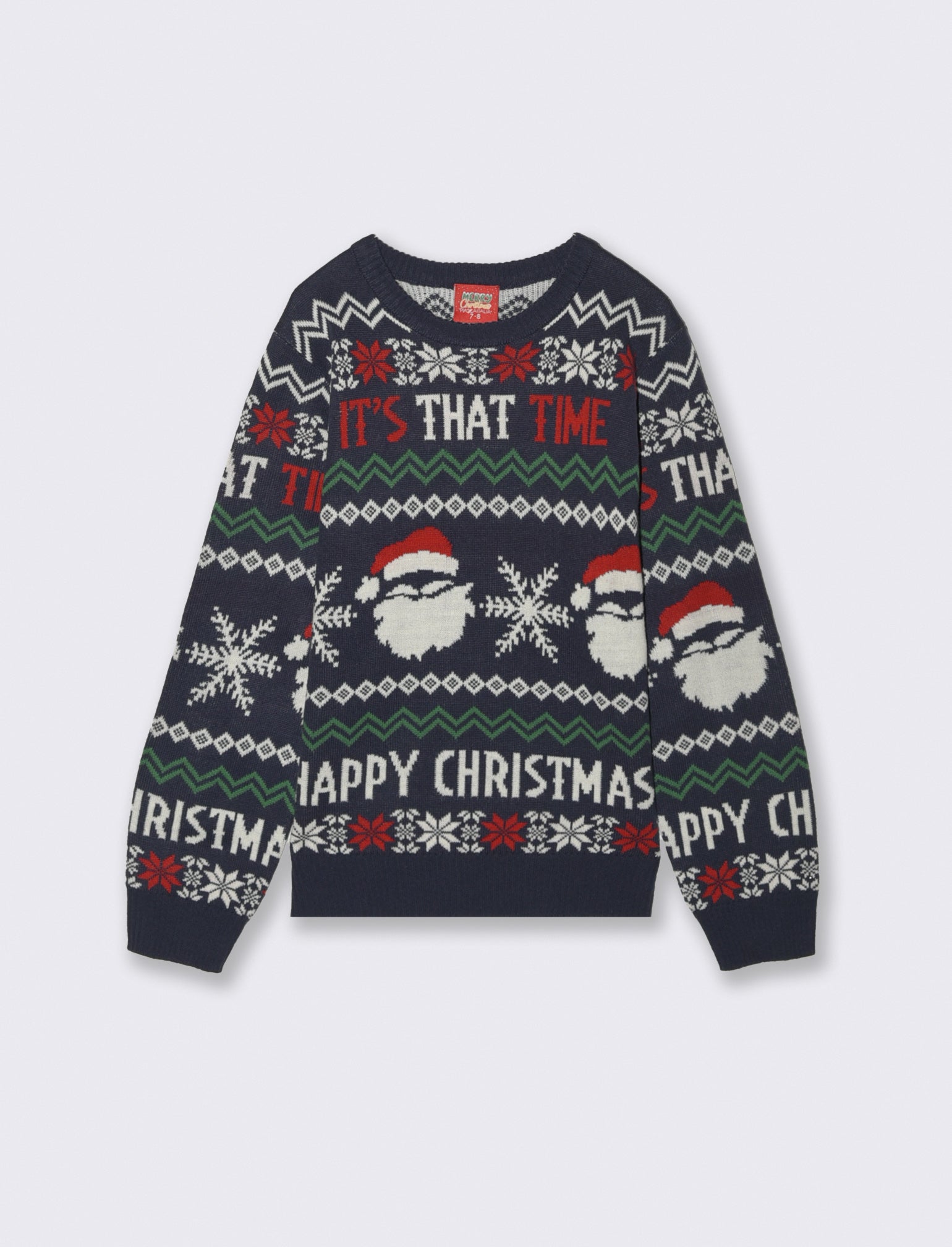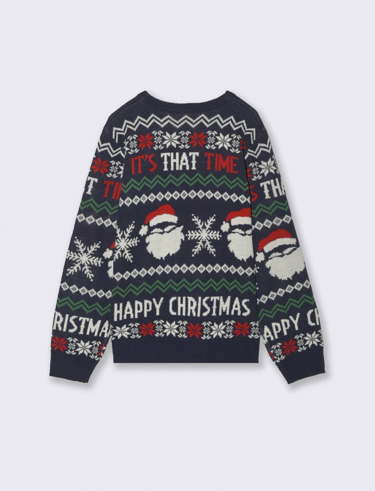 Pullover in morbida maglia jacquard, modello a girocollo. Bordo a coste sullo scollo, a fondo manica e in basso Vestibilità regular. Il maglione di Natale per eccellenza! Il prodotto è di colore Blu