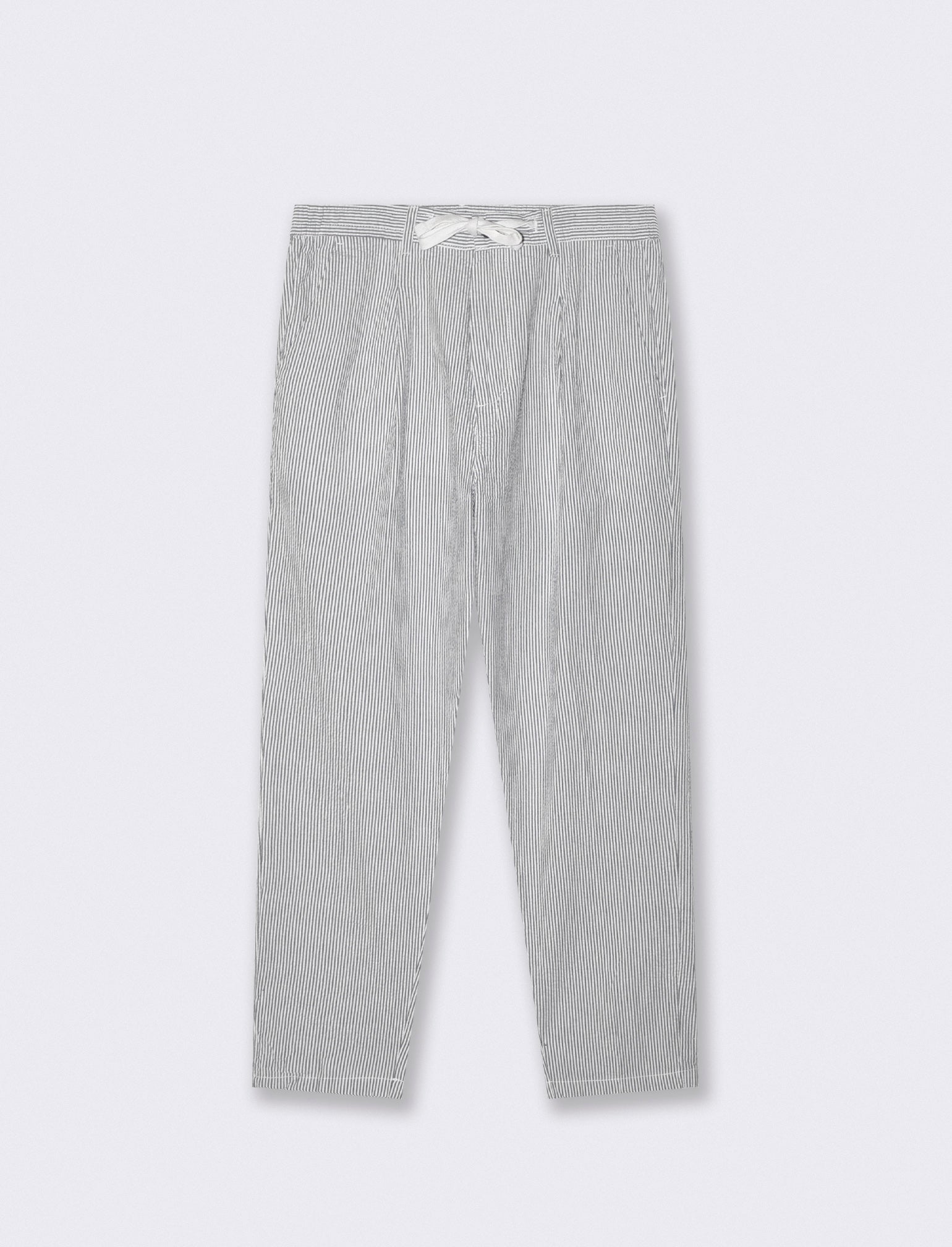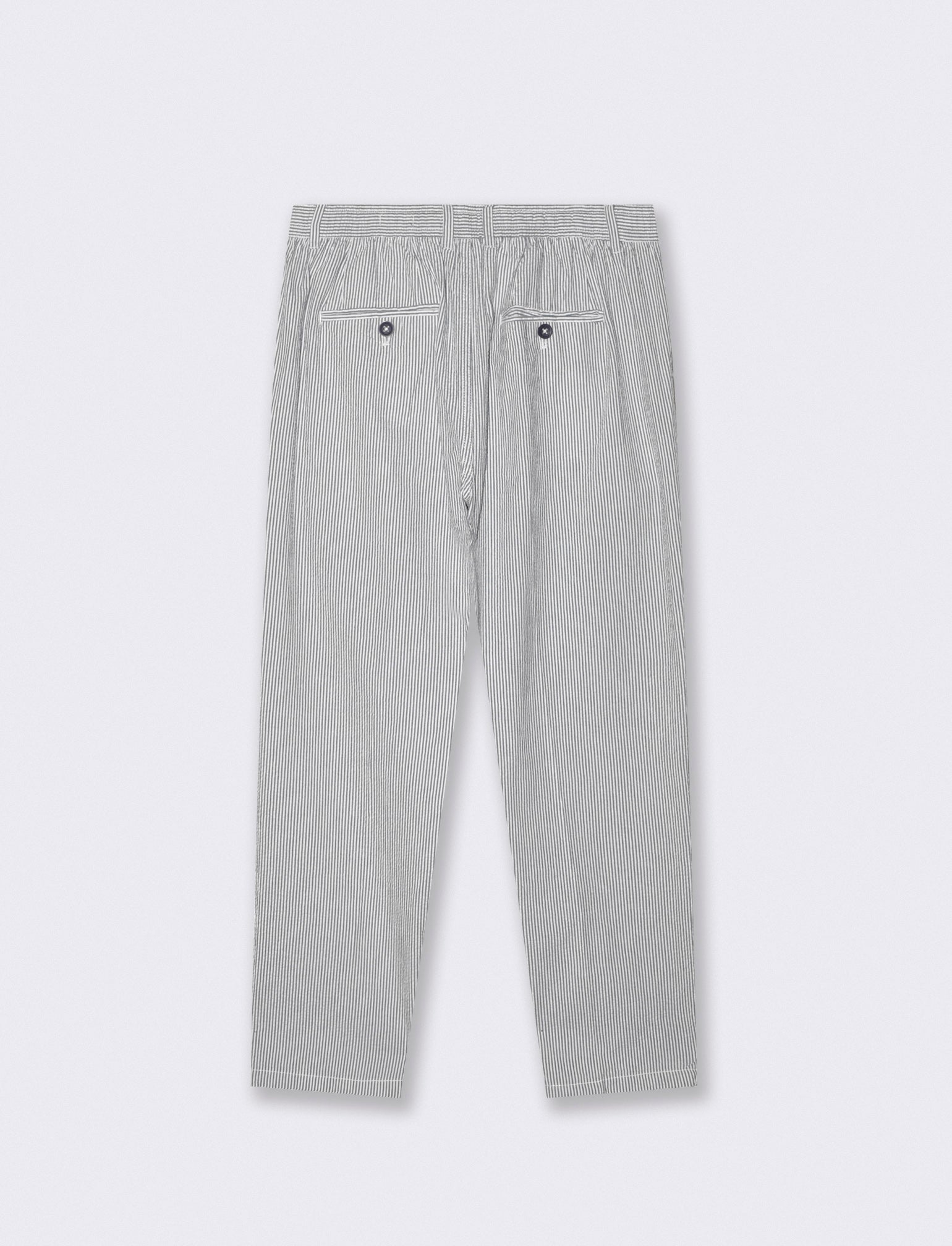 Pantaloni chino jogger. Tessuto 100% cotone seer sucker. Fantasia a righe Vita elasticizzata regolabile con laccio. Tasche anteriori e dettaglio di tasche a filetto posteriori con bottoni. Il prodotto è di colore Blu
