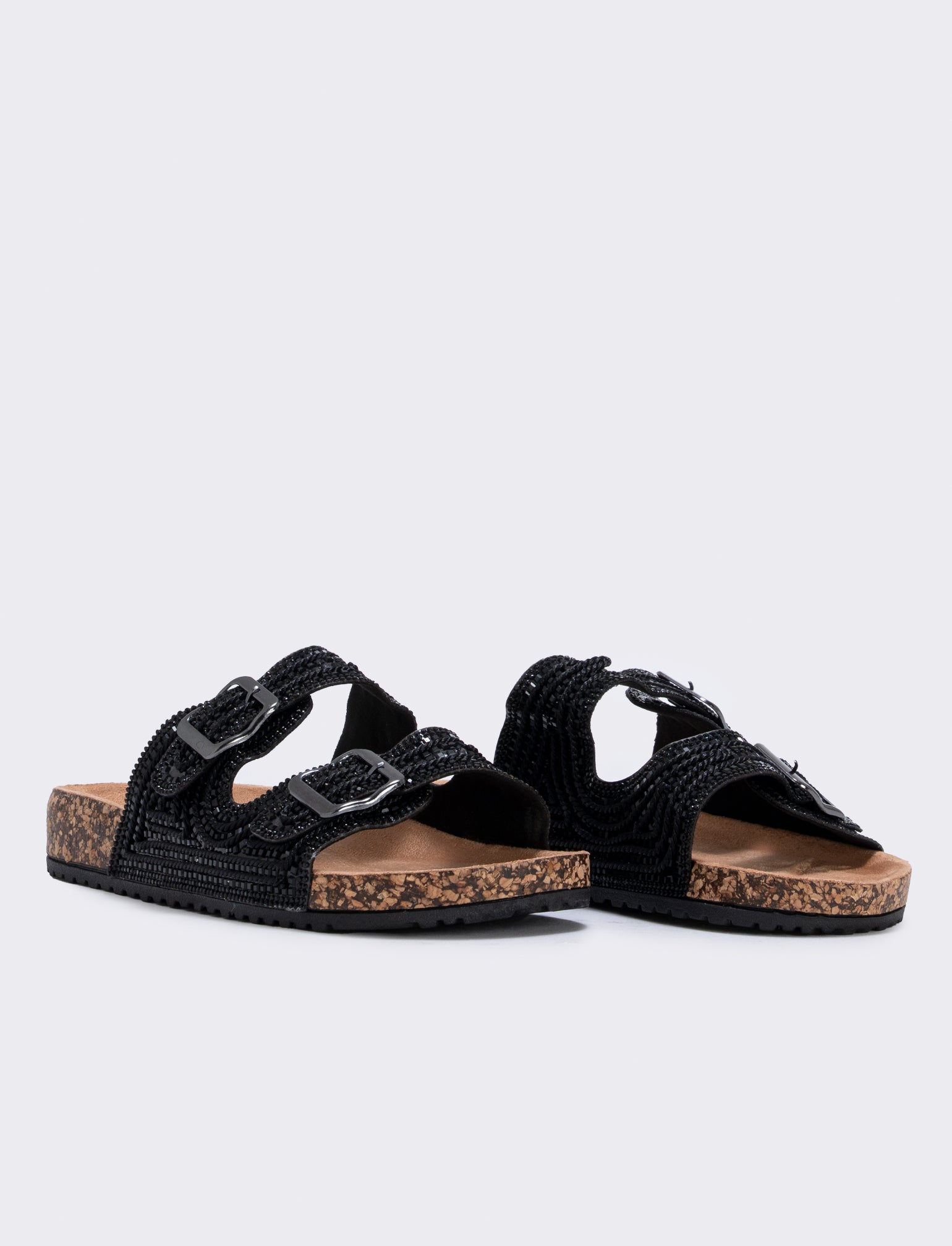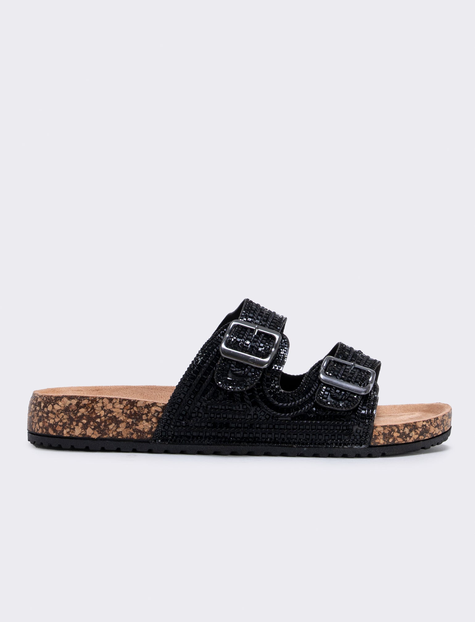 Sandalo in poliuretano, rivestito da strass con due fasce munite di fibbia. In due varianti colore. Il prodotto è di colore Nero