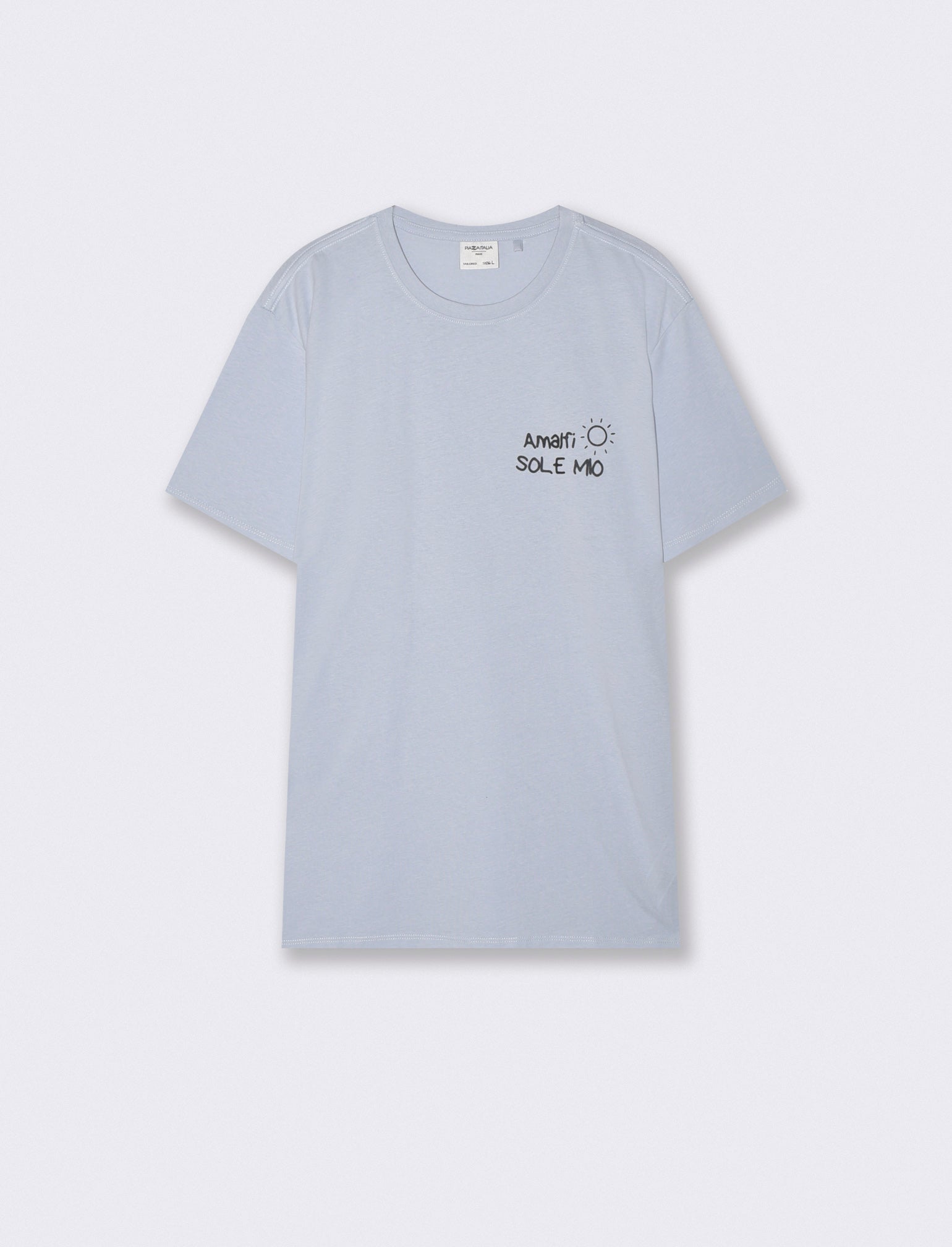 T-shirt girocollo maniche corte regular fit in jersey puro cotone con stampa effetto spray a contrasto sul davanti e sul dietro. Il prodotto è di colore Celeste polvere