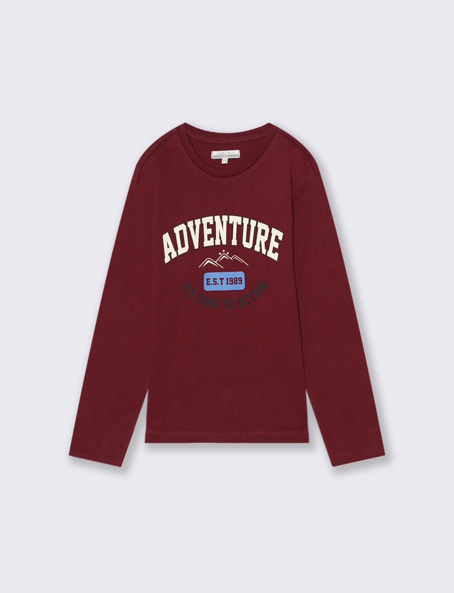 T-shirt a maniche lunghe in morbido jersey di cotone. Bordo a costine sullo scollo. Il capo presenta una stampa frontale. Disponibile in diversi colori. Vestibilità regular, utilizzabile in qualsiasi occasione. Il prodotto è di colore Bordeaux