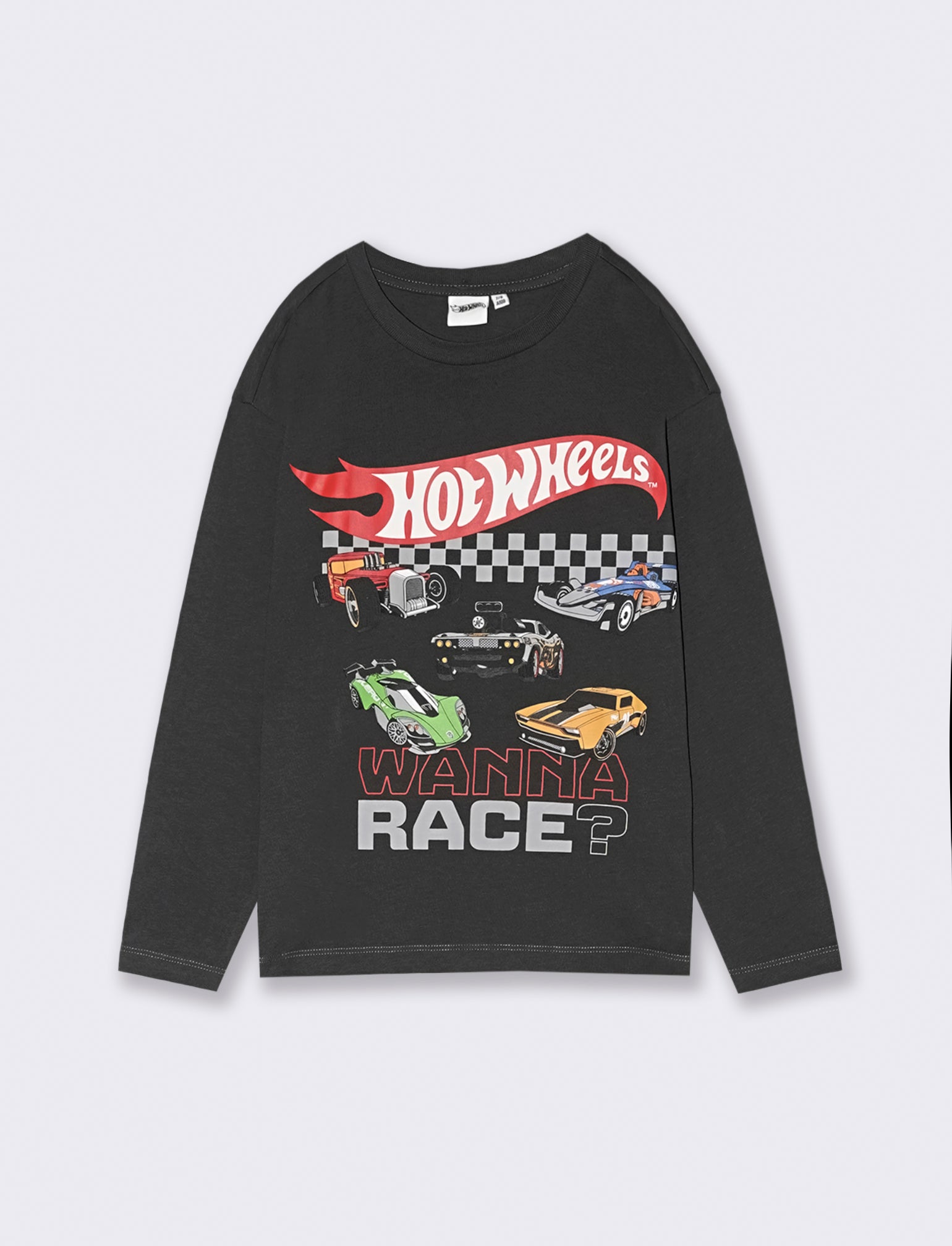 T-SHIRT GIROCOLLO IN COTONE LICENZA HOT WHEELS, CON STAMPA FRONTALE DISPONIBILE IN 2 VARIANTI. Il prodotto è di colore Grigio piombo