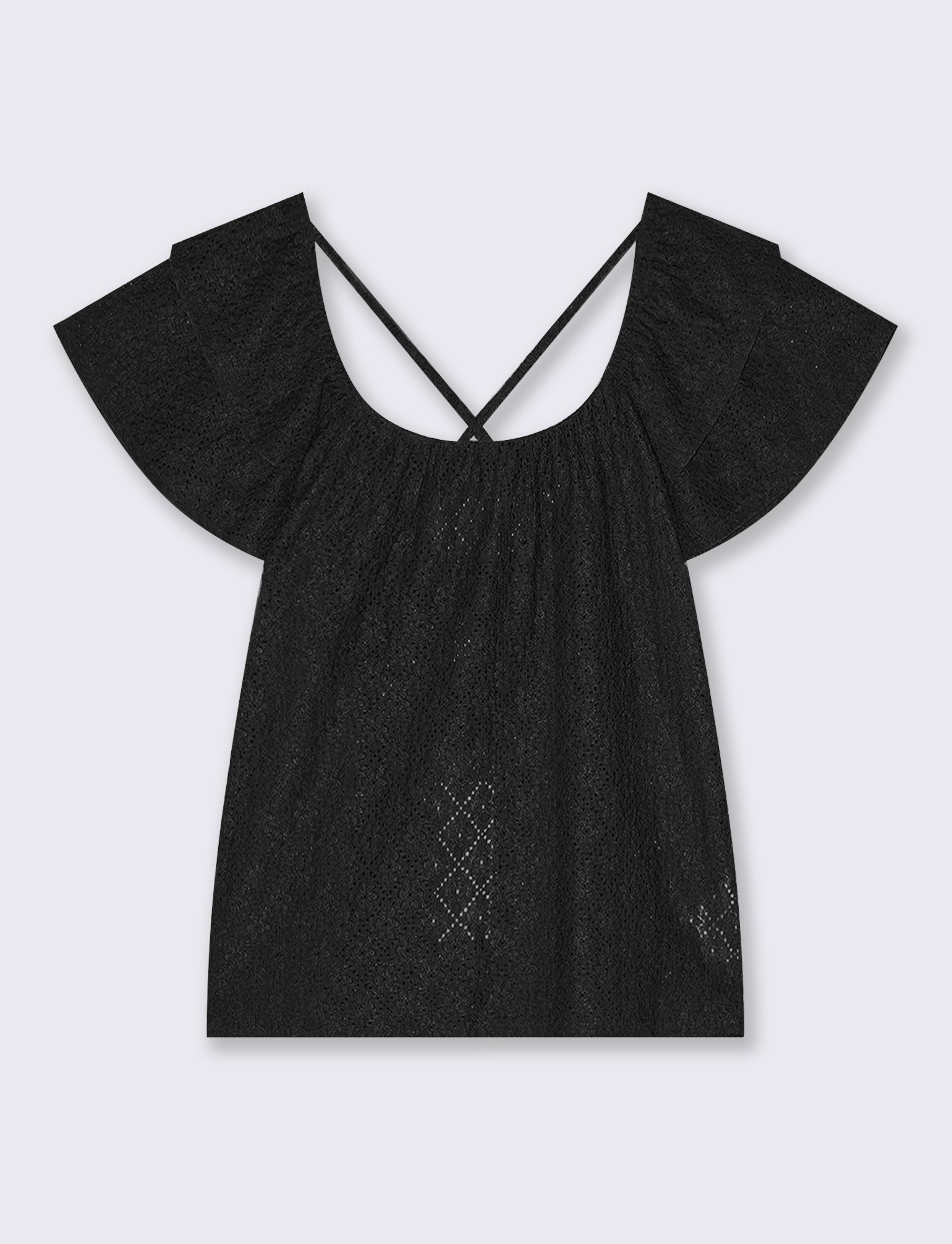 T-SHIRT MANICA CORTA RAGLAN A SBUFFO, SCOLLO QUADRATO LEGGERMENTE ELASTICIZZATO SUL DAVANTI E SCOLLO PROFONDO CON DETTAGLIO DI LACCETTI INCROCIATI SUL RETRO. Il prodotto è di colore Nero