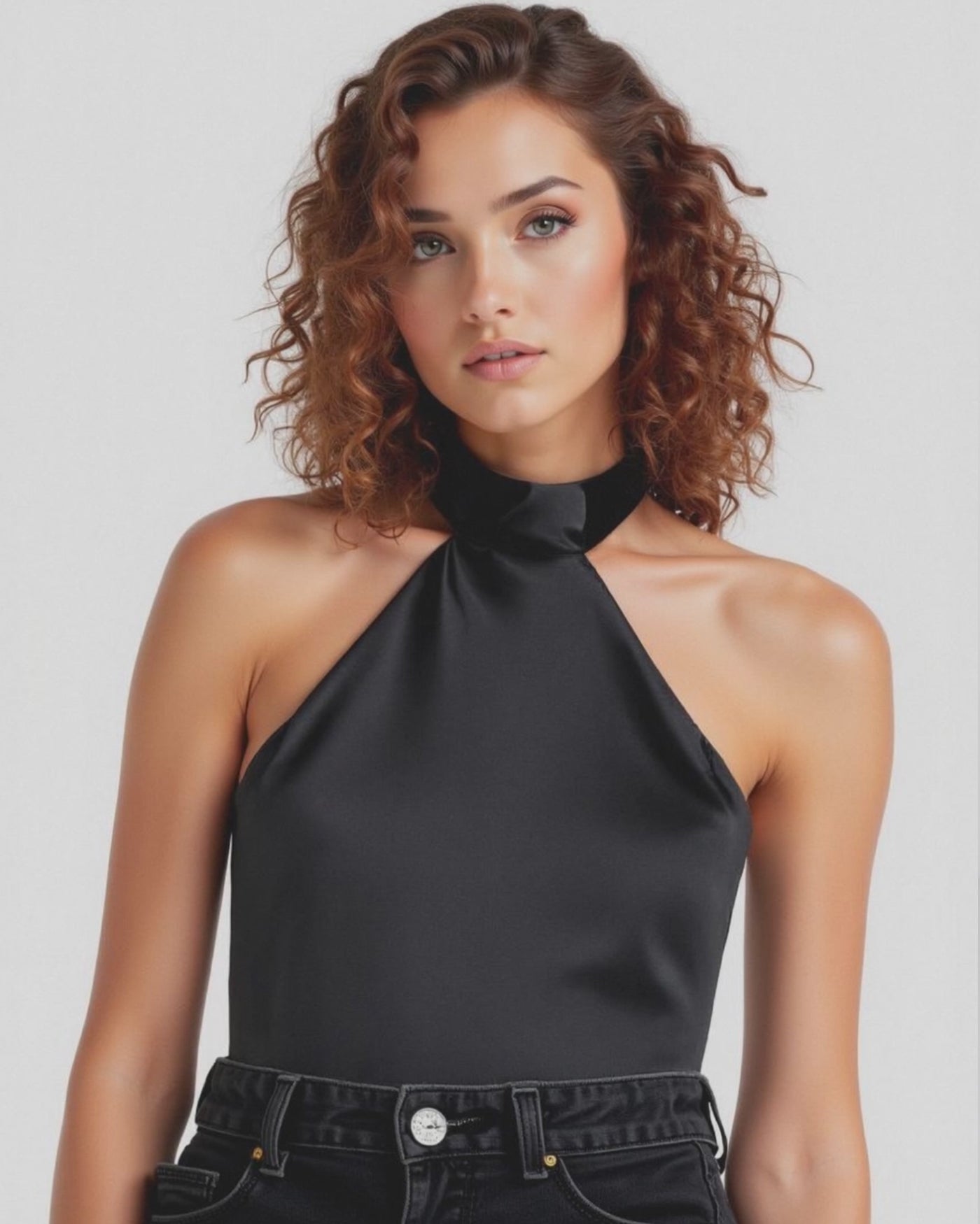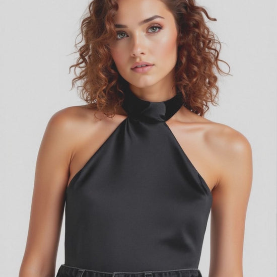 Top in raso scollato con scollo all'americana Il prodotto è di colore Nero