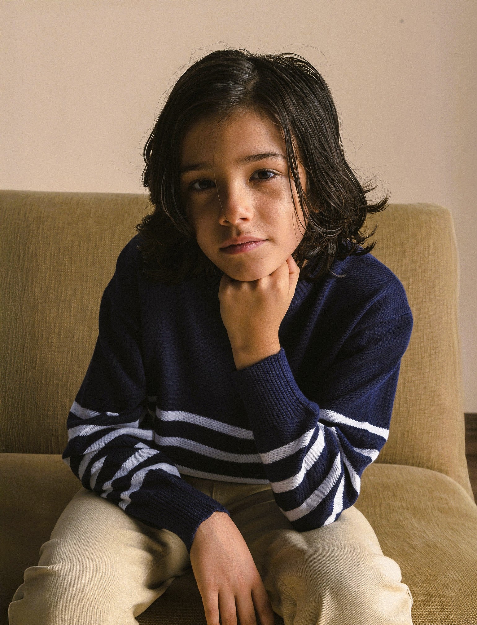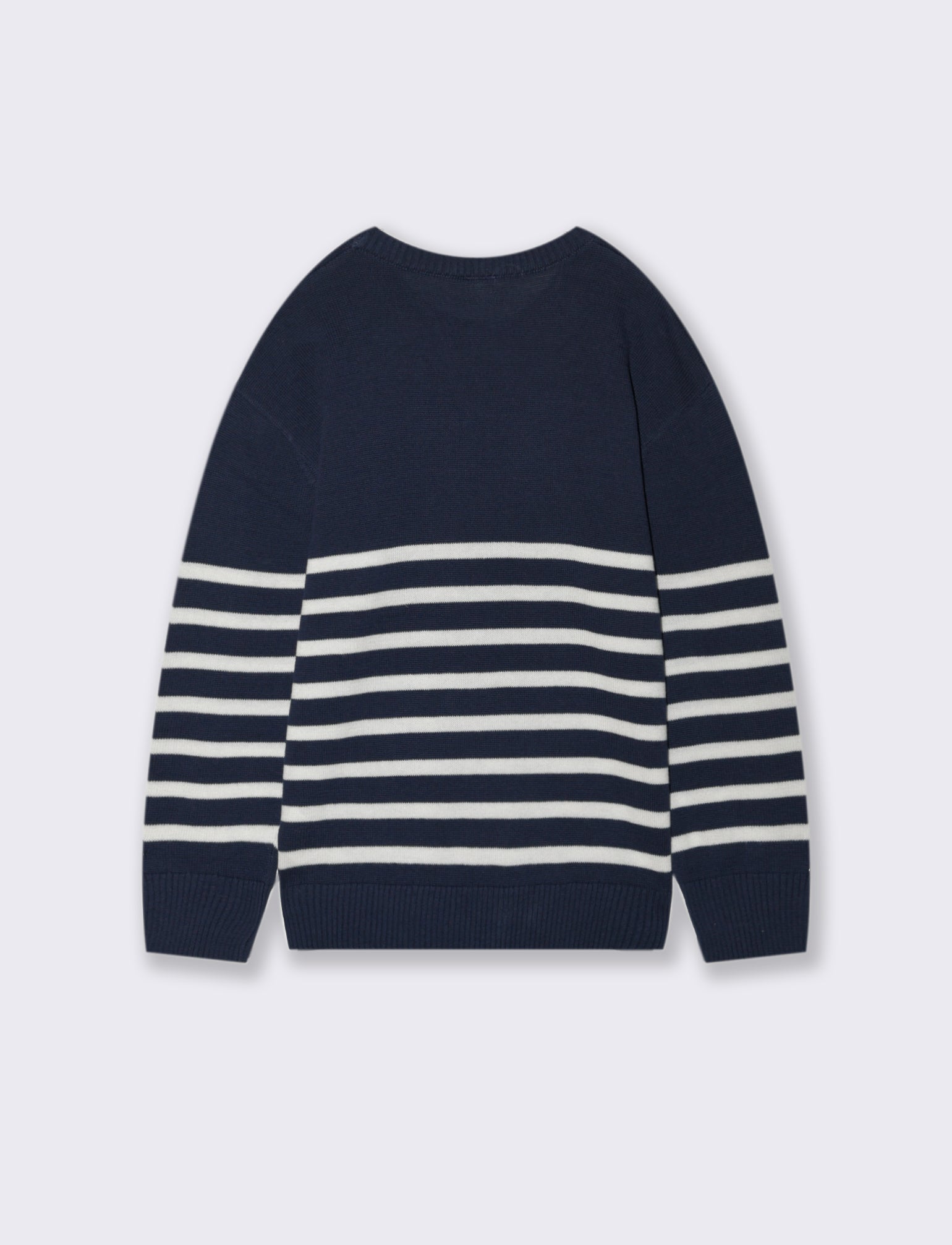 Maglia tricot fantasia a riga. Fondo corpo girocollo e maniche in costina. Il prodotto è di colore Blu