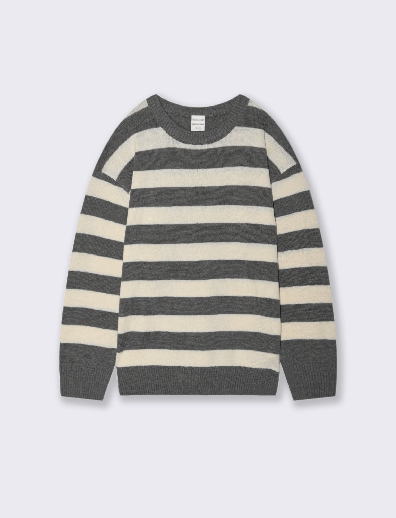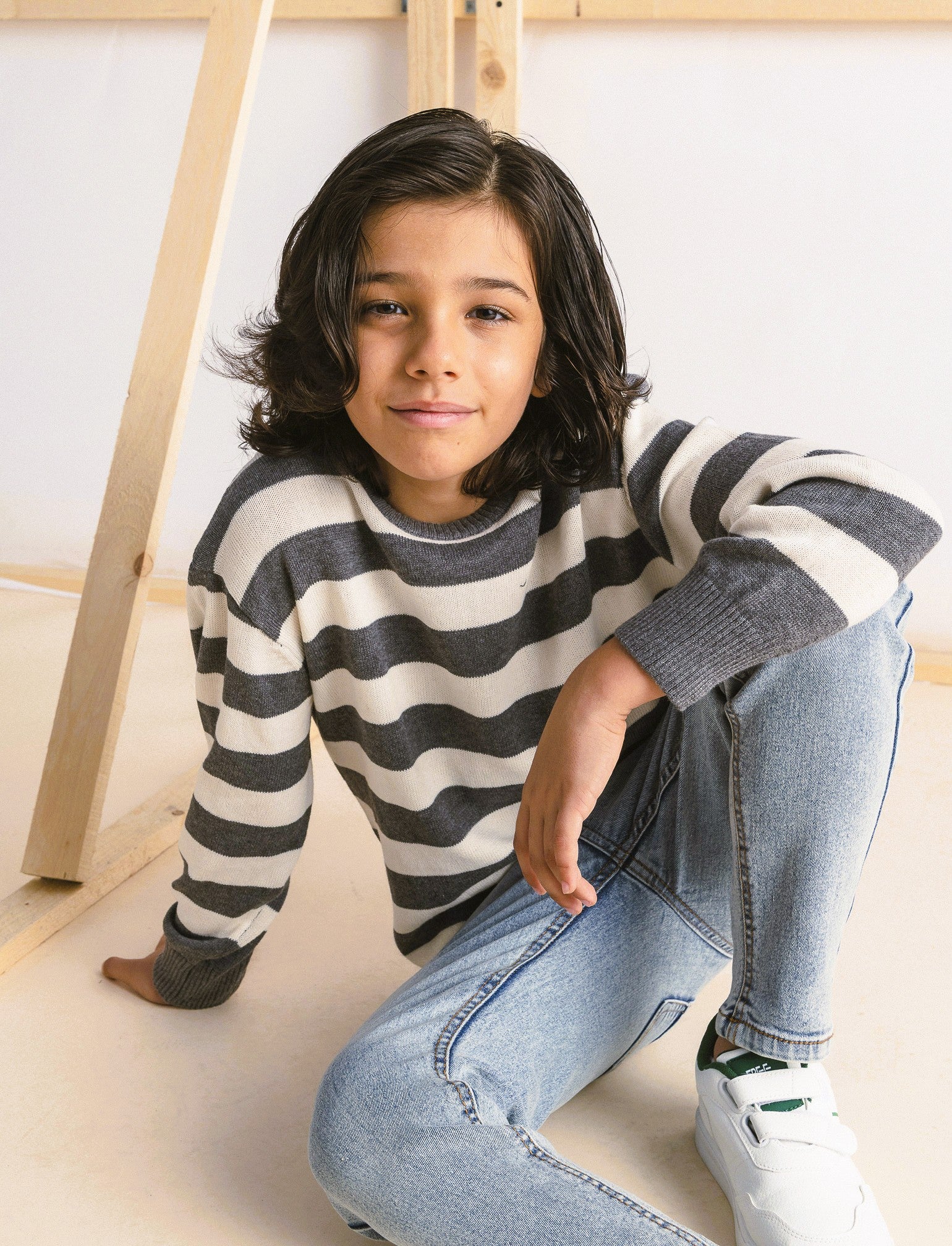 Maglia tricot fantasia a riga. Fondo corpo girocollo e maniche in costina. Il prodotto è di colore Grigio