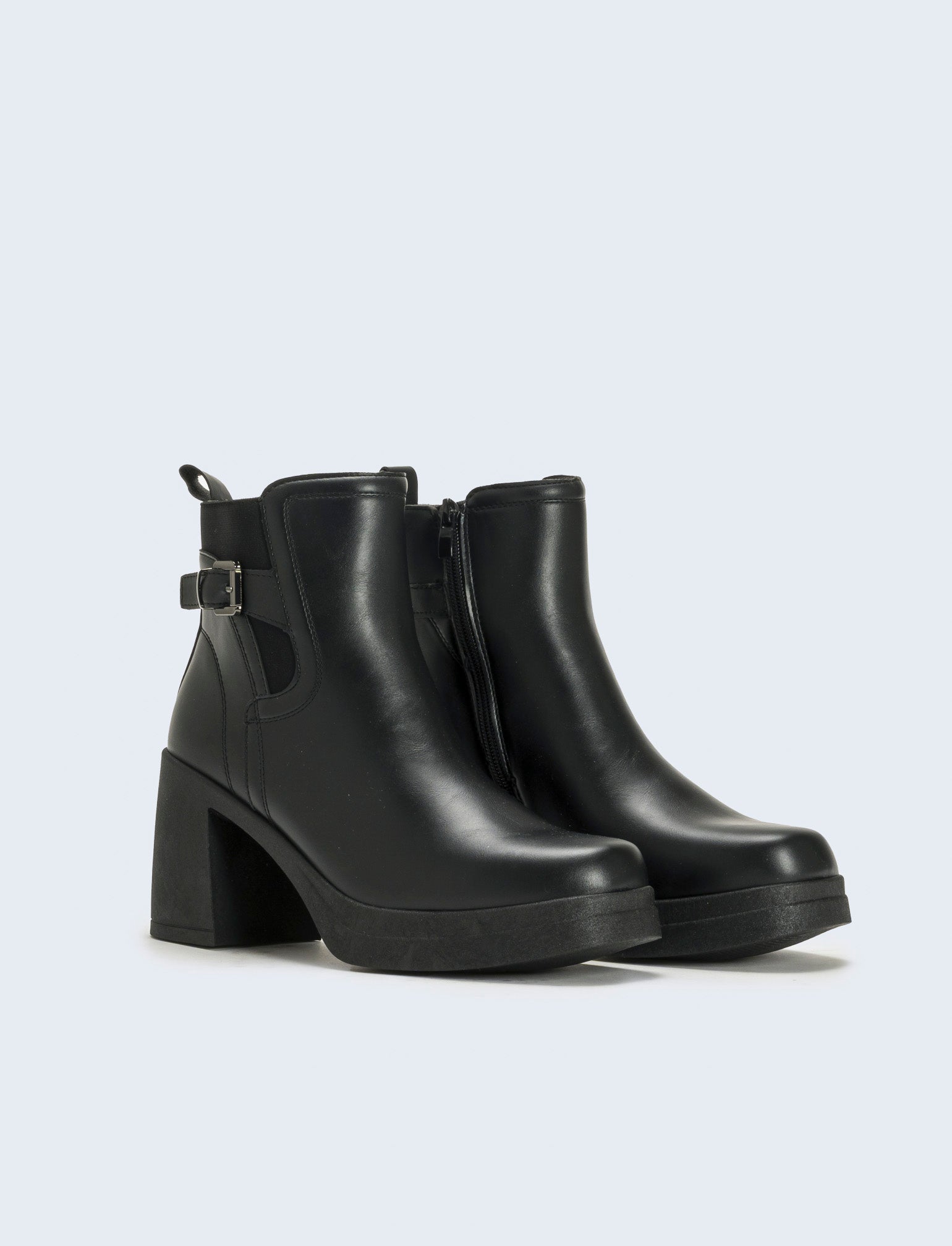 Tronchetto in poliuretano nero con fibbia e tacco 90 mm. Il prodotto è di colore Nero